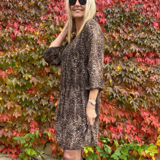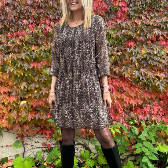 Effortlessly chic and endlessly versatile, this 4 Season Animal Print Dress is your go-to piece for every occasion. Crafted from lightweight plissé fabric, it offers a flattering drape with a subtle textured finish that moves beautifully with you. The timeless animal print adds a bold yet sophisticated touch, making it easy to dress up or down across all seasons. Featuring a relaxed silhouette, three-quarter sleeves, and a knee-length hem, this dress delivers both comfort and style. Pair it with boots for autumn adventures, heels for evening elegance, or sandals for a breezy summer look.