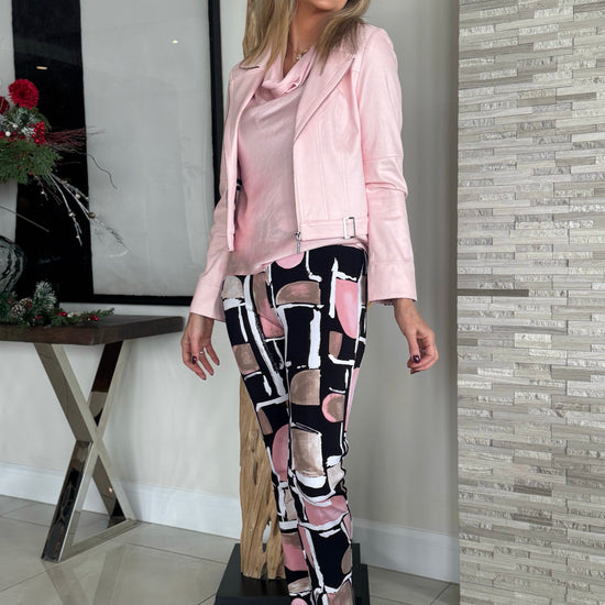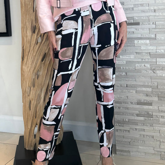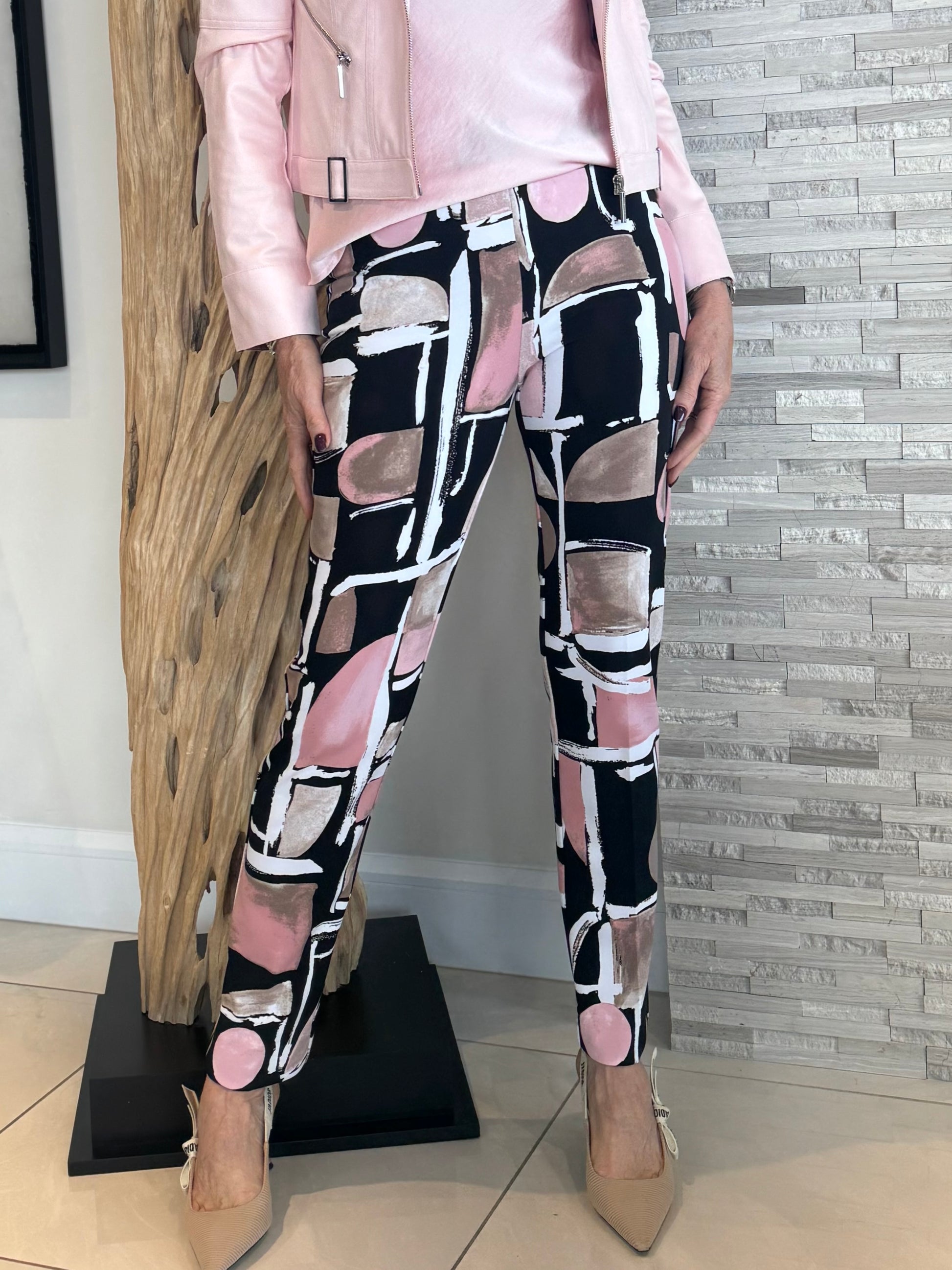 This bonded silky knit pants features an abstract print and a sleek straight leg cut. The covered elastic waistband ensures ease, while subtle back slits at the hem bring a modern finish.