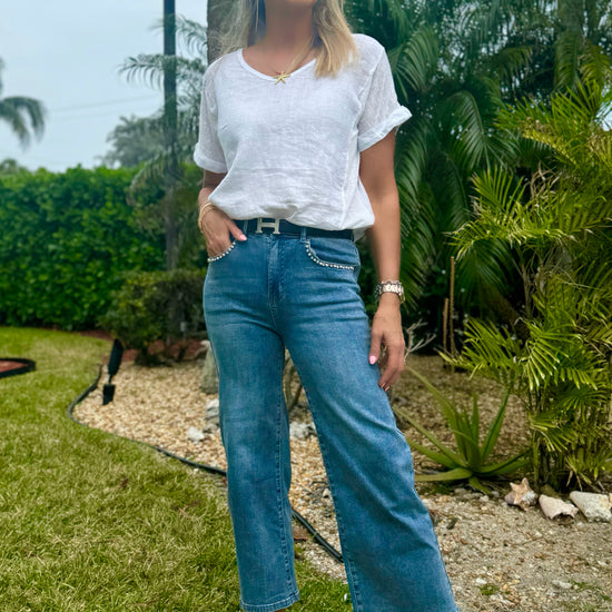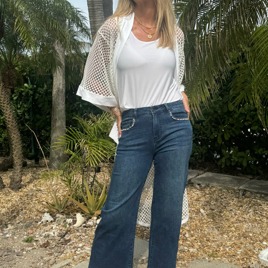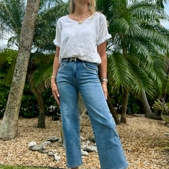 Super comfortable jeans featuring a 5-pocket design, belt loops, and stunning pearl and stone embellishments on the pockets. These ankle-length flare jeans are made from a super stretchy fabric for a perfect fit.