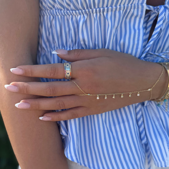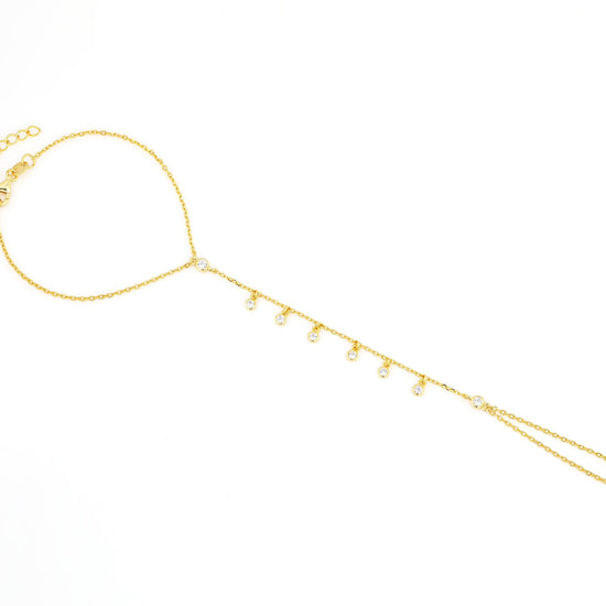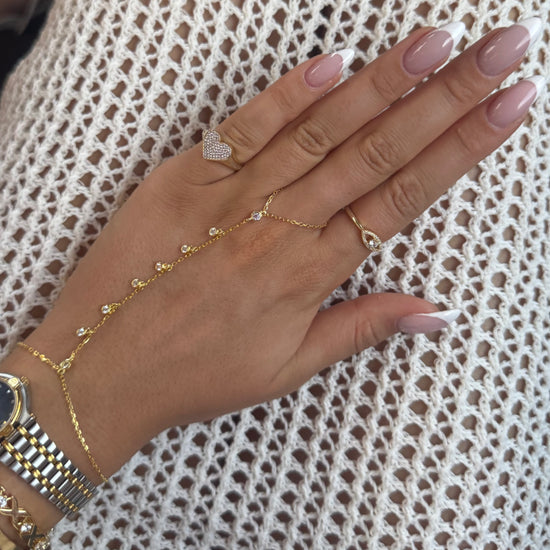 Delicate yet daring — this gold hand chain brings sparkle to every gesture. Featuring CZ dangle accents that shimmer with your every move, it’s the ultimate piece to elevate your wrist stack or add a little edge to a mani moment 💫