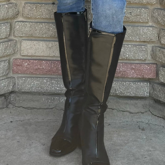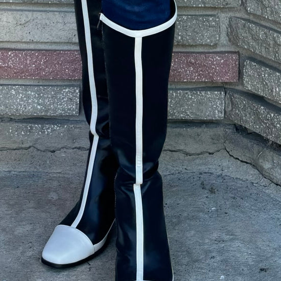 These high-heel boots are this year’s must-have trend! Featuring side zippers for easy wear, a block heel for stability, and waterproof design for all-weather versatility, they offer ultimate comfort and style. Crafted from certified vegan patent leather, these boots come in two stunning options: a two-tone version with white strip detailing and a white toe, and an all-black version for a sleek, versatile look. Perfect for pairing with any outfit!