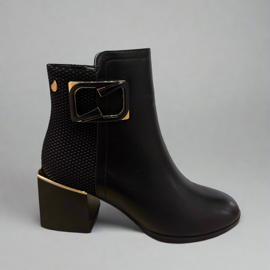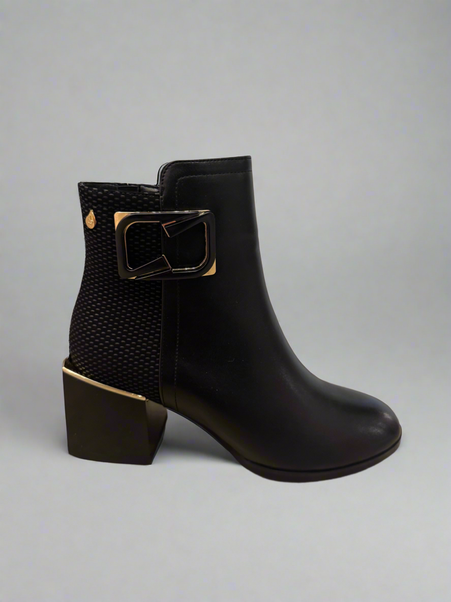 Chic and modern, this vegan leather ankle bootie features a sleek heel, an elegant black-and-gold buckle, and a convenient side zipper. Designed with waterproof protection, it’s the perfect mix of style and practicality.