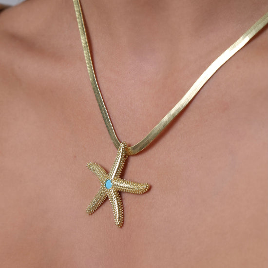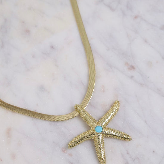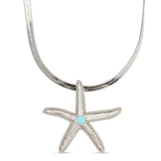 This necklace is a must-have for your next getaway! It pairs perfectly with your favorite dress or swimsuit. The starfish features a stunning textured design, set on a sleek snake chain with a lobster claw clasp. Its eye-catching turquoise center adds a pop of color to complete the look.