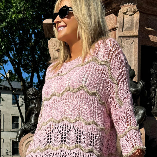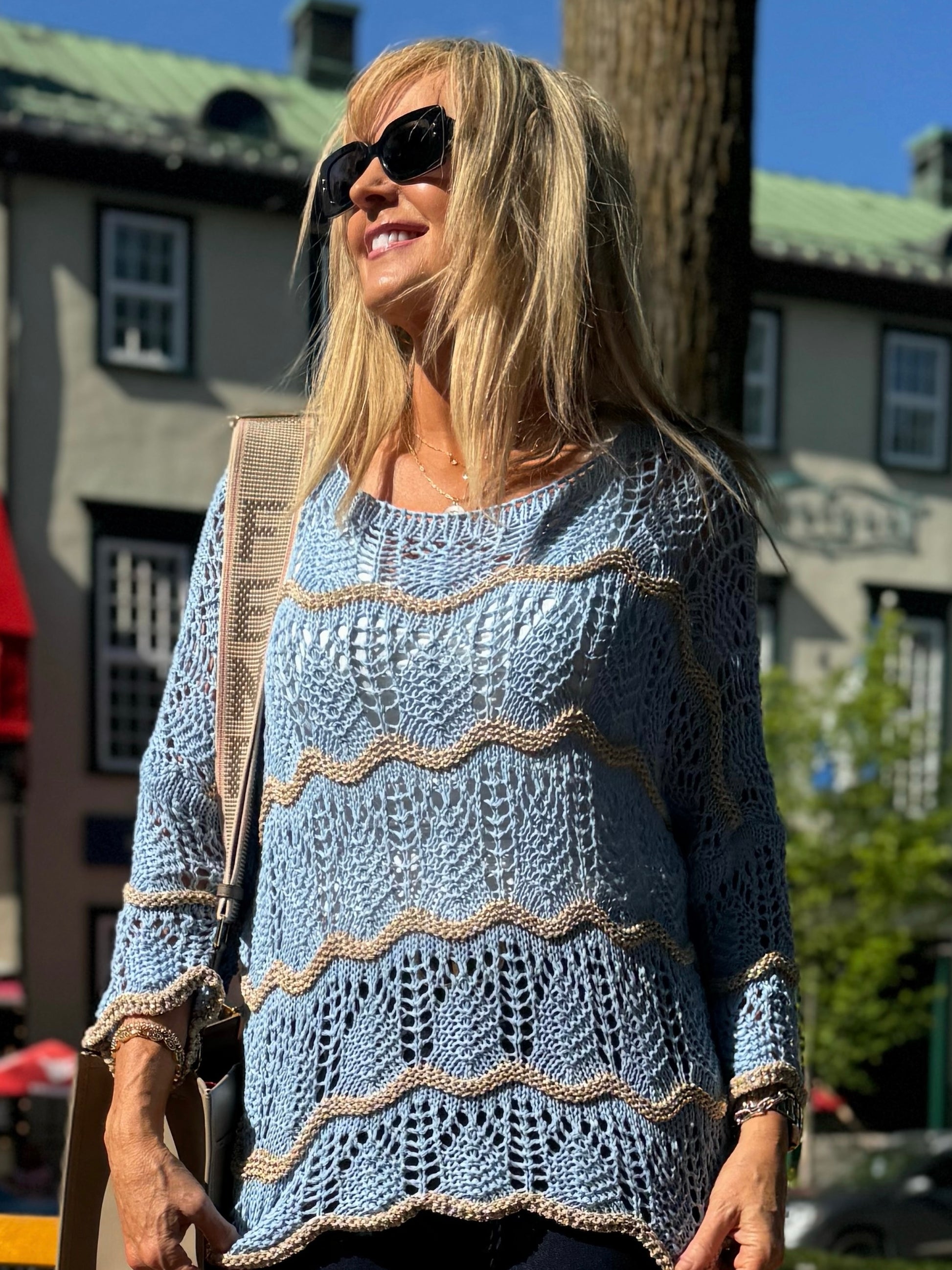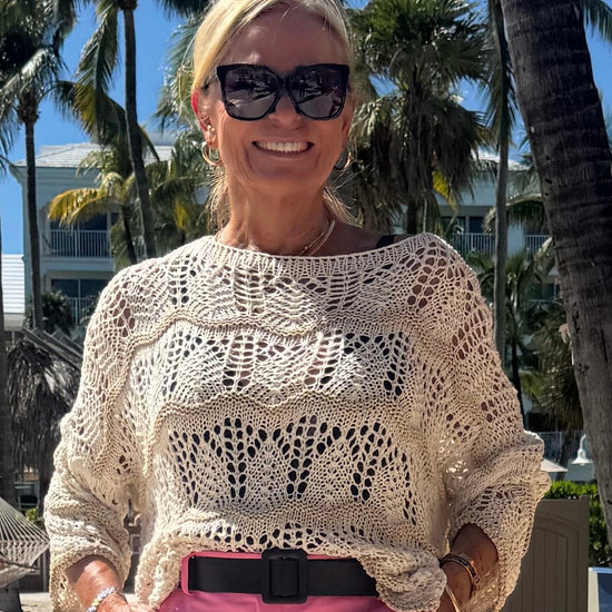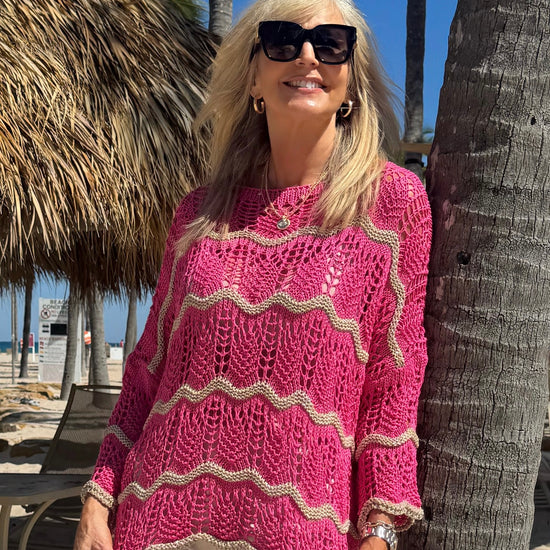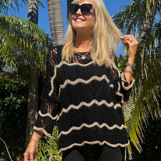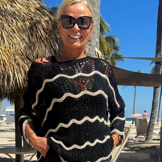 Crafted in Italy, this piece features a stunning silhouette with a crochet-style knit that’s ideal for year-round wear. It showcases dolman 3/4 sleeves, contrast wave-like striping, and a flattering bateau neckline. One size would fit up to an XL.