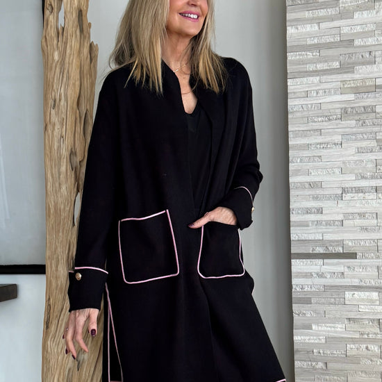 Elevate your wardrobe with this beautiful, luxurious cardigan. Crafted from soft, high-quality material, it features elegant pink contrast piping, gold button detailing on the sleeves, and a chic front kangaroo pocket. Subtle side slits add comfort and movement, making it perfect for layering or wearing on its own for a polished, sophisticated look.