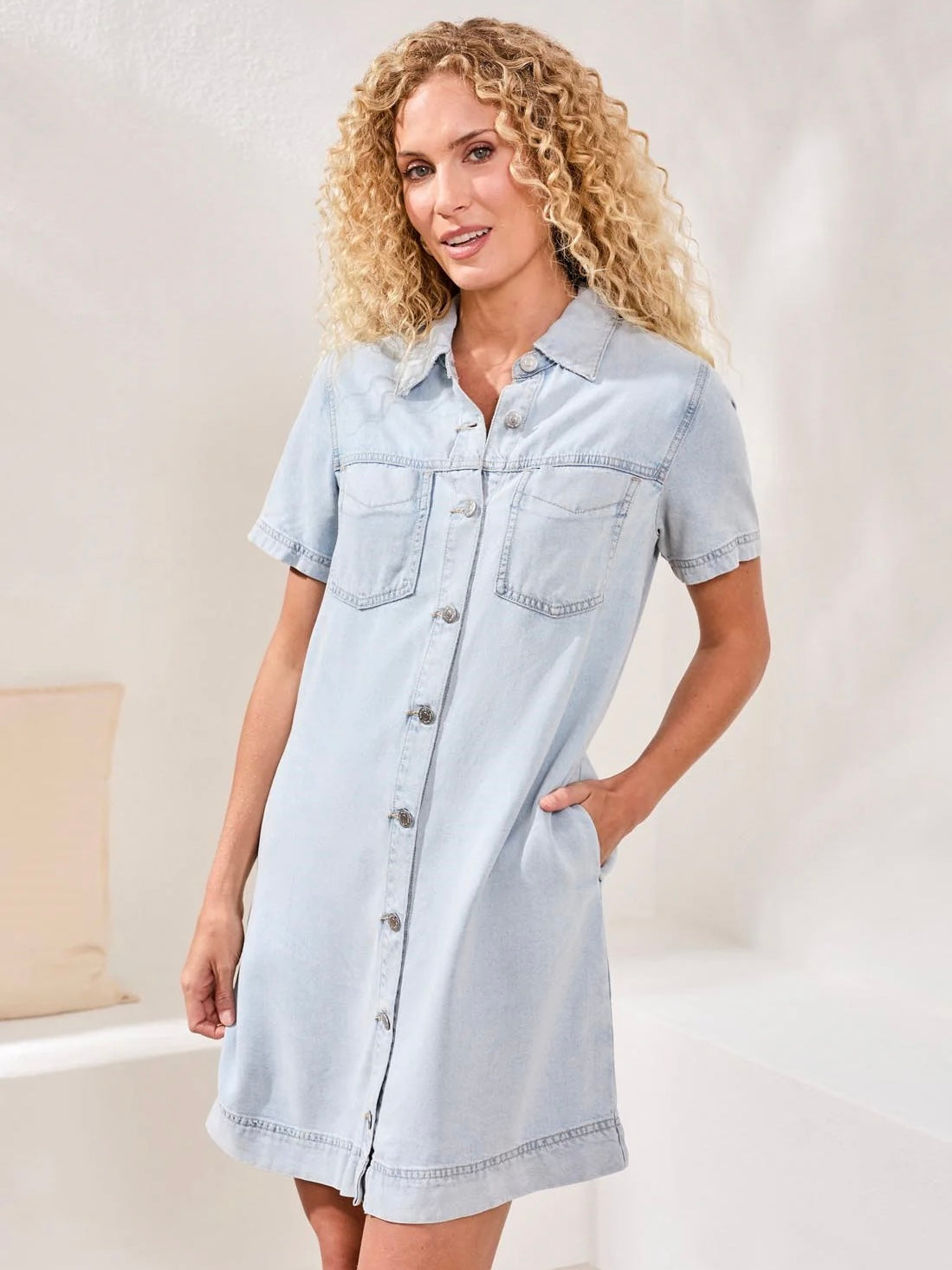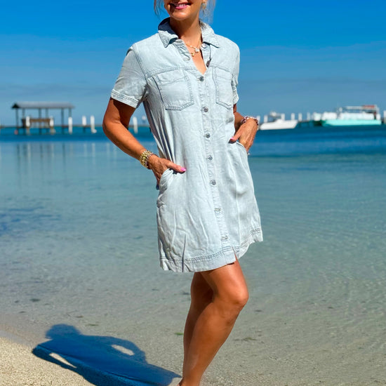 Denim Shirt Dress featuring a classic button-up front with sleek silver hardware. Designed with two front chest pockets and two side pockets, plus a collared neckline for a timeless, put-together look. Crafted from premium-quality denim with short sleeves that offer just the right amount of upper-arm coverage. An effortless way to look polished, pulled together, and chic with minimal effort.