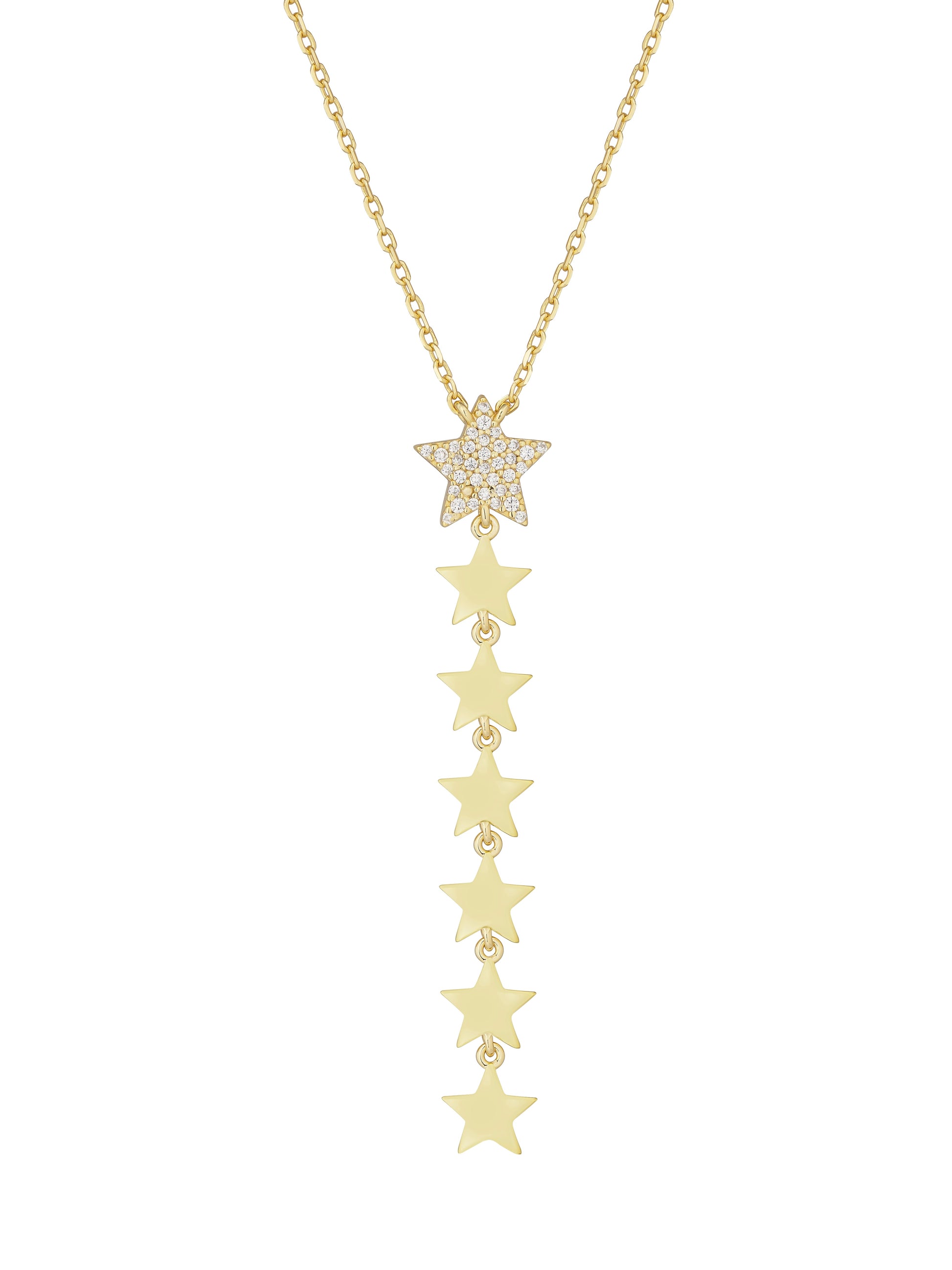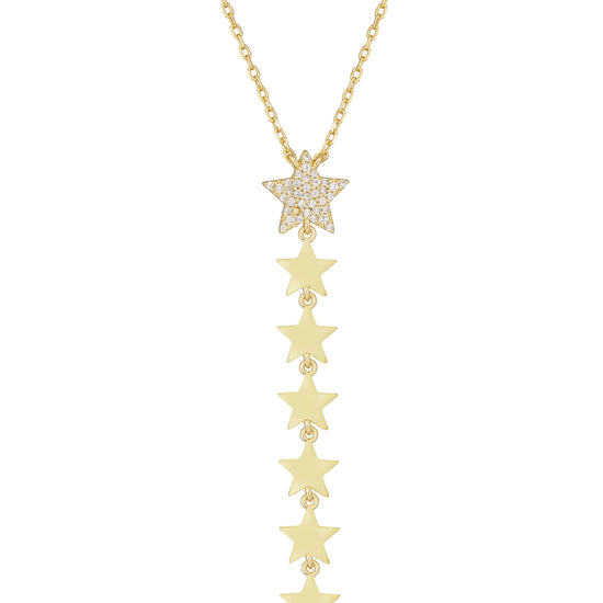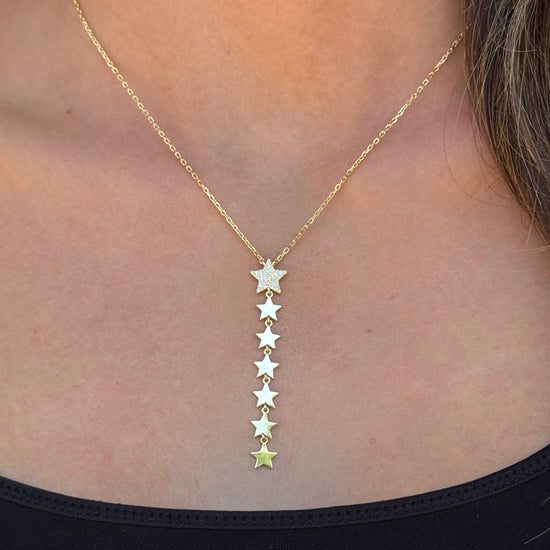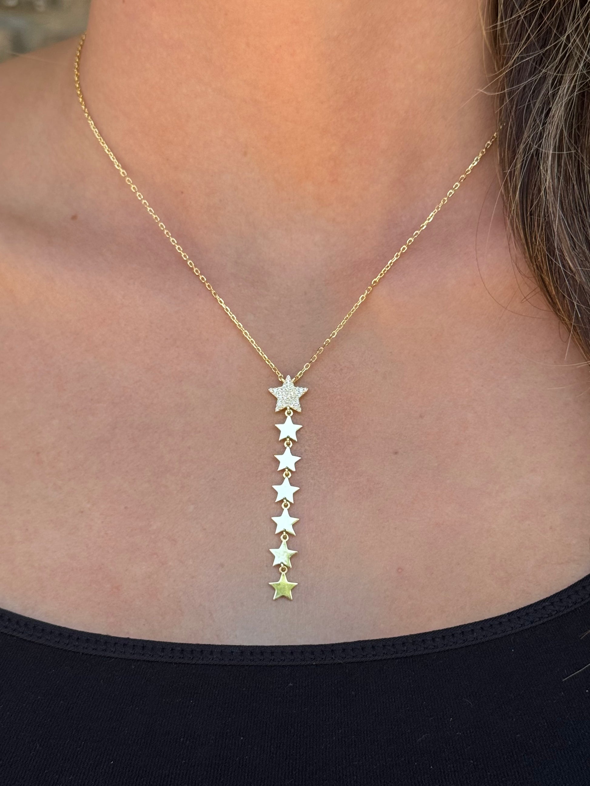 The ÉTOILE Necklace features a shimmering pavé crystal star that anchors a golden cascade of mini stars, dancing in the light like a trail of magic. Made to turn heads, layer with charm, and shine from day to night.