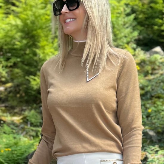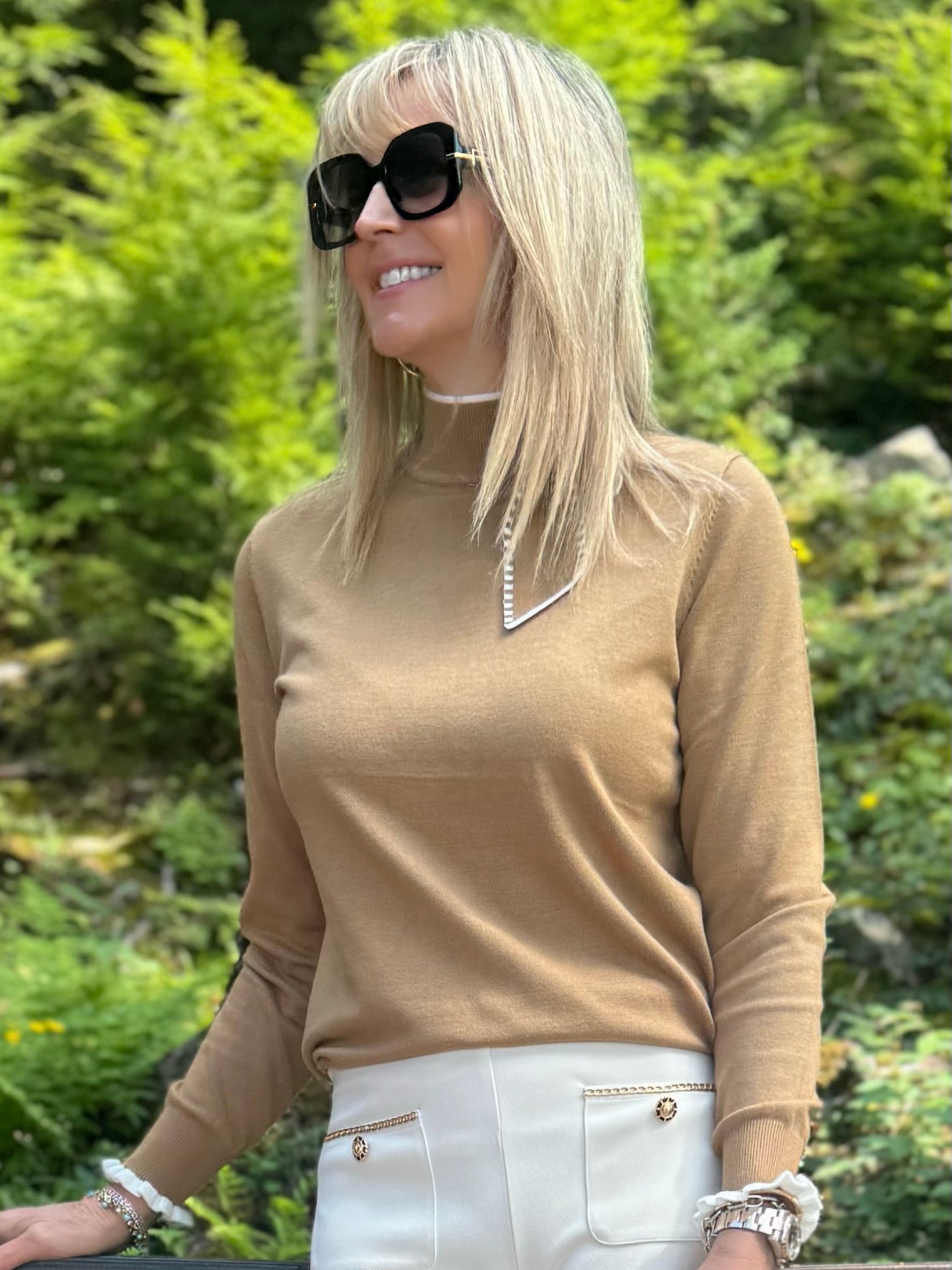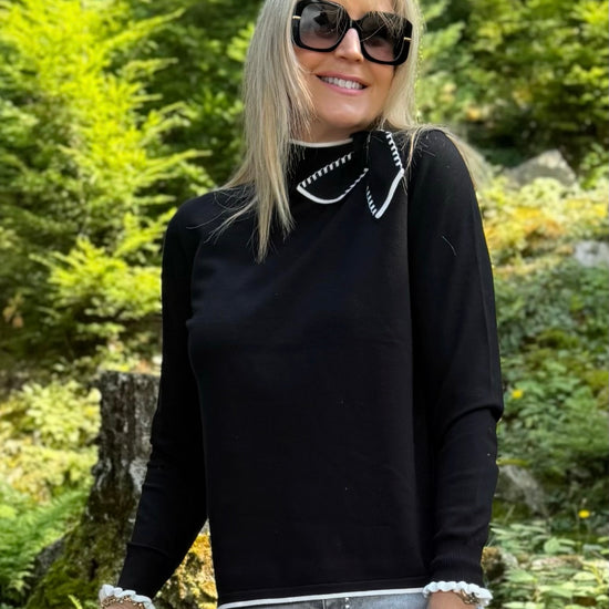 A beautiful contrast knit top with an elevated twist. Designed with a slight mock neck and a chic bow-tie detail that can be untied or removed for versatile styling. The contrast piping along the sleeves adds definition, finished with a touch of ruffle detail for subtle femininity. A contrasting border at the hem completes the look, making this the perfect basic-with-a-twist piece to dress up or down.