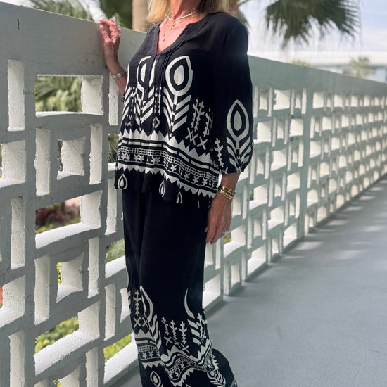 Effortless comfort meets standout style with this pull-on printed pant. Designed with a smooth elastic waistband, it offers an easy, flattering fit with no zippers or buttons, just slip on and go. The relaxed, flowy leg creates beautiful movement while elongating the silhouette, and the bold border print at the hem adds a striking, coordinated touch. Lightweight and comfortable, these pants are perfect for travel, dinner out, or an elevated everyday look. Preorder for March.