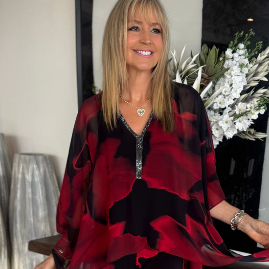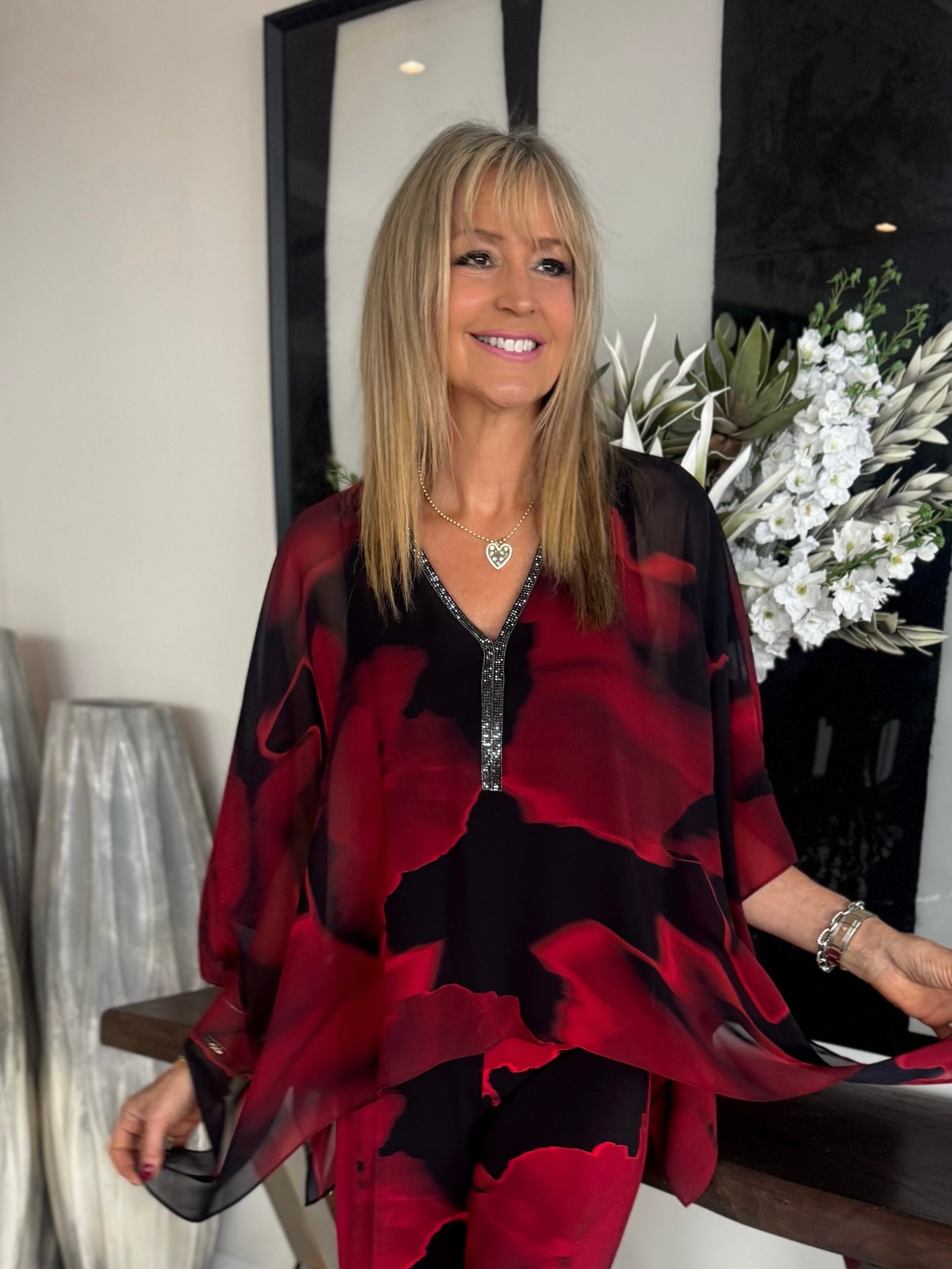 This poncho top, tailored in a beautiful recycled chiffon fabric, presents a luxurious abstract print and a chic V-shaped neckline accessorized with a delicate rhinestone band detail. Three-quarter dolman sleeves and a silky knit under-camisole complete the garment’s polished look.