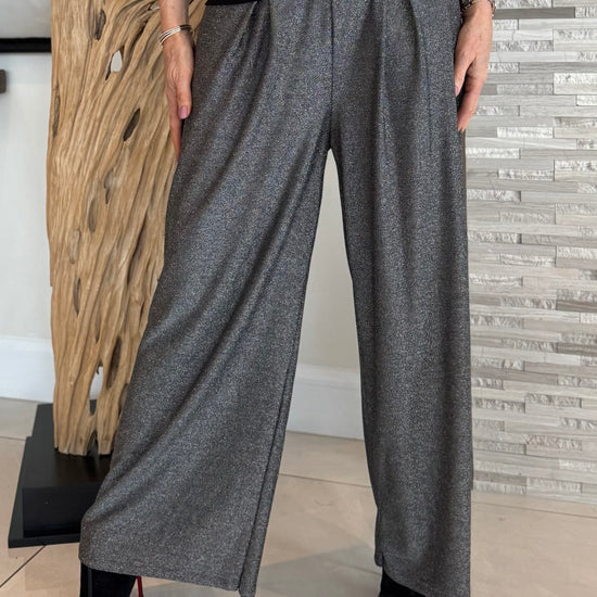 Elevate your evening look with these chic Made in Italy sparkle pants. Designed with a comfortable pull-on elasticized waistband, they offer effortless fit and all-day ease. The elegant inverted front pleat creates a sleek, elongated leg line while adding subtle structure to the soft, fluid fabric. Lightweight with a hint of shimmer, these pants move beautifully and pair perfectly with any dressy top.