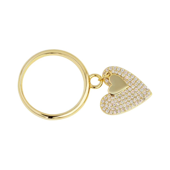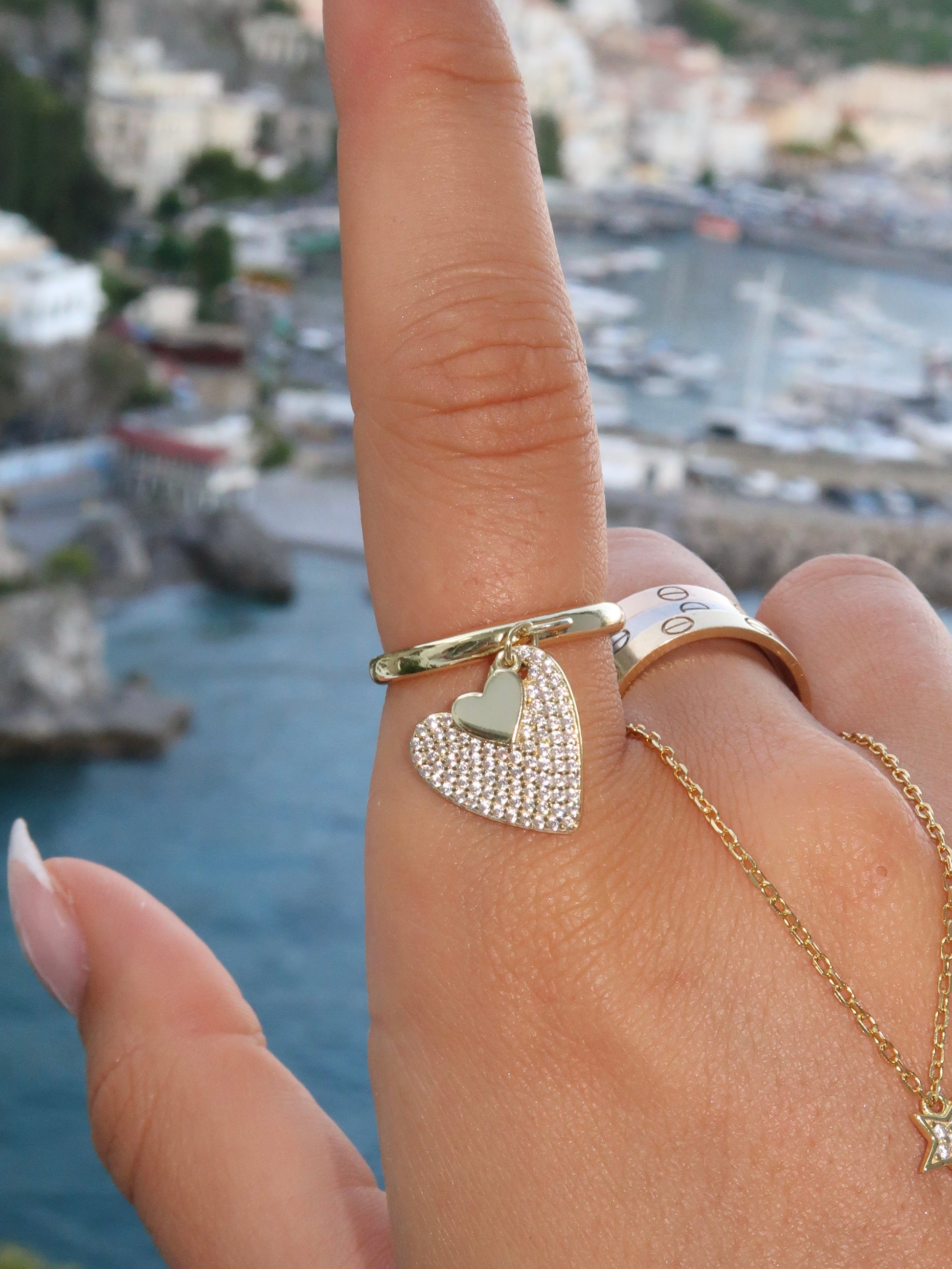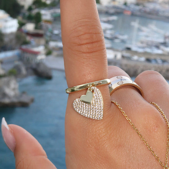 14k gold vermeil over a solid 925 sterling silver base, this romantic ring features a sparkling pavé heart charm layered with a glossy golden heart for the sweetest dimension. Finished with an extra layer of anti-tarnish E-coating for everyday shine. Lightweight, eye-catching, and perfect for stacking or wearing solo.