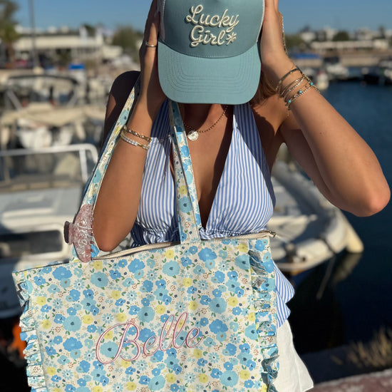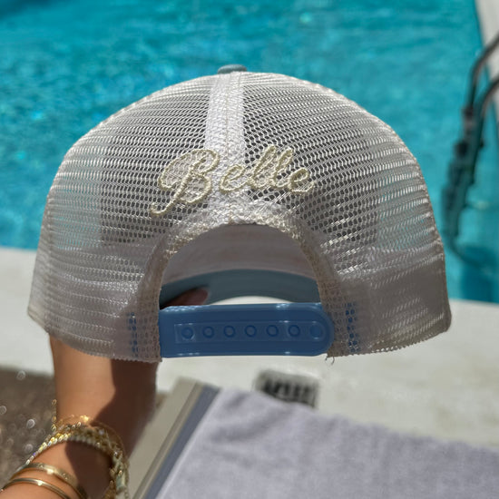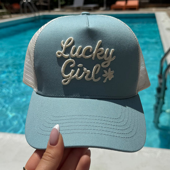 Channel your inner “lucky girl” energy under the Mediterranean sun with this limited-edition trucker hat. Featuring soft blue and white embroidery on a crisp white and mesh base, this cap is your perfect Euro summer essential. Lightweight, breathable, and effortlessly cool – just like you. Whether you're island hopping or exploring ancient ruins, this is the finishing touch to your vacation glow.