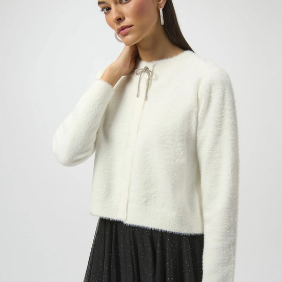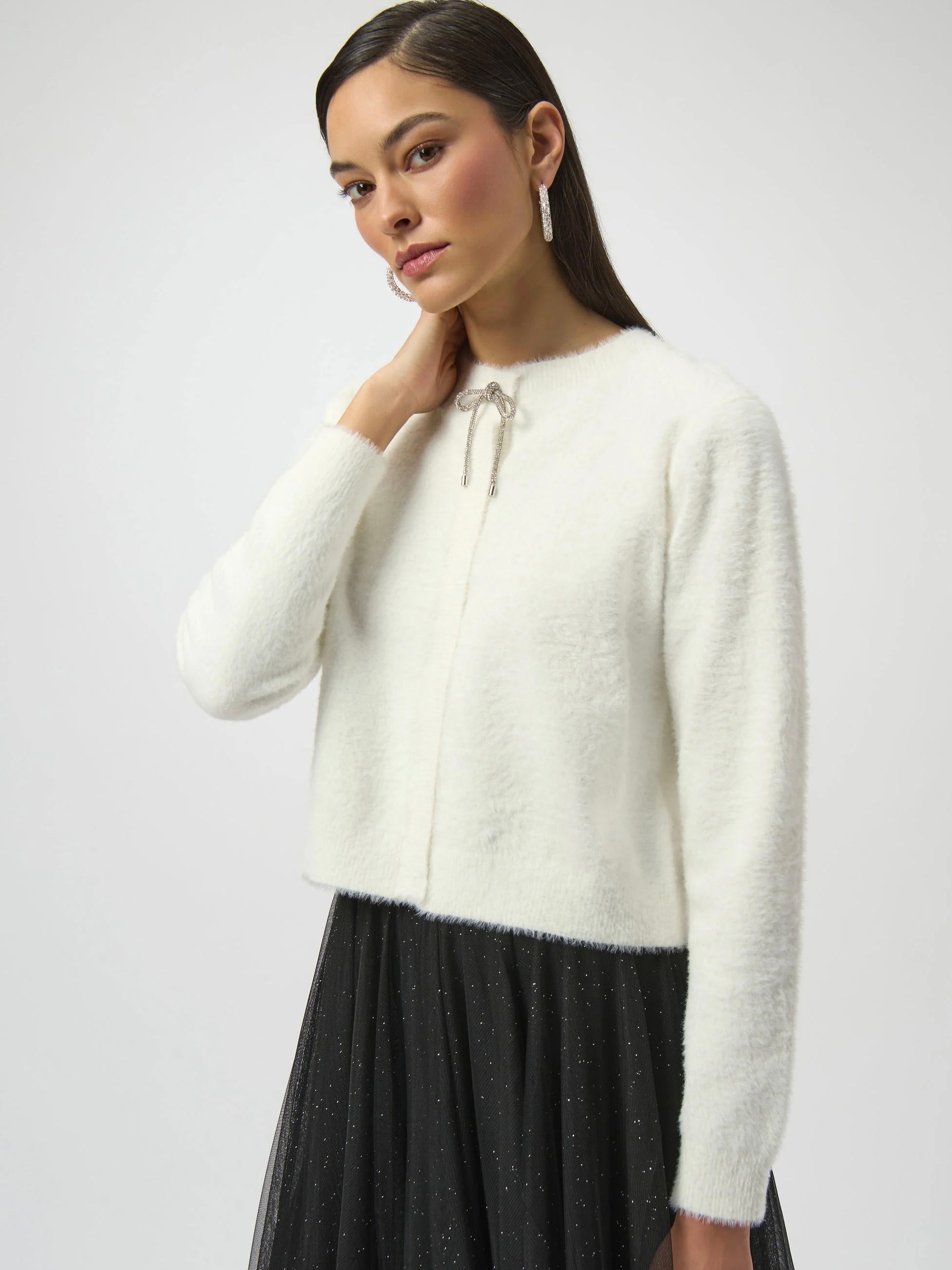 This charming long sleeve cardigan features a delicate rhinestone bow at the neckline, adding a chic touch to any look. Crafted from soft feather yarn with a discreet snap closure, it offers lightweight warmth, making it perfect for any season.
