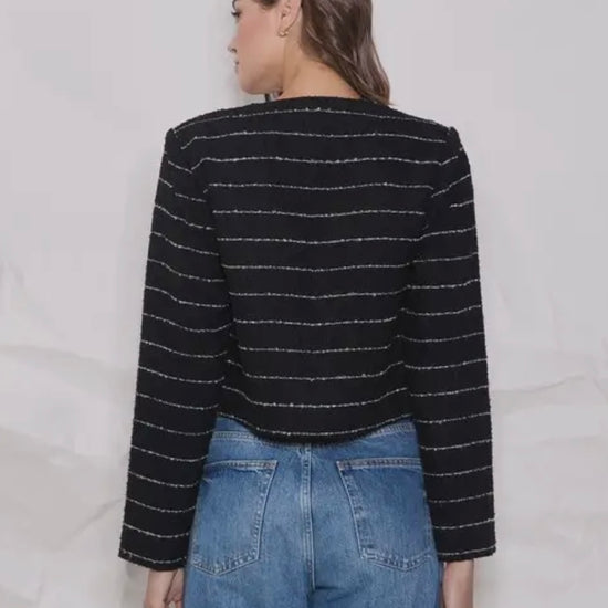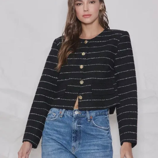 An elegant striped tweed jacket/blazer crafted from high-quality fabric, featuring a soft, luxurious lining for added comfort. The stunning gold button details elevate the look, allowing you to wear it buttoned up or open for versatile styling. Perfectly paired with jeans, a skirt, or dress pants for a chic, sophisticated outfit. Made in China.