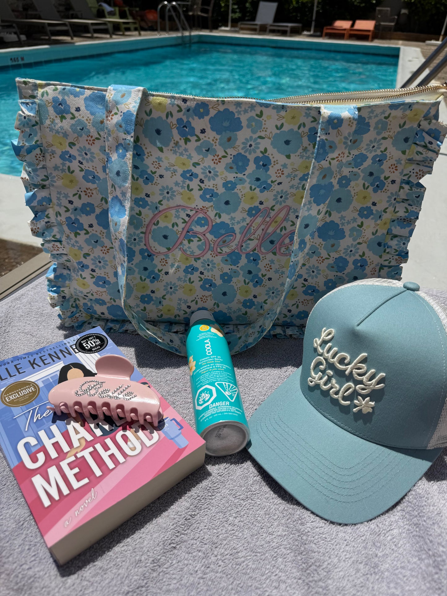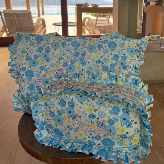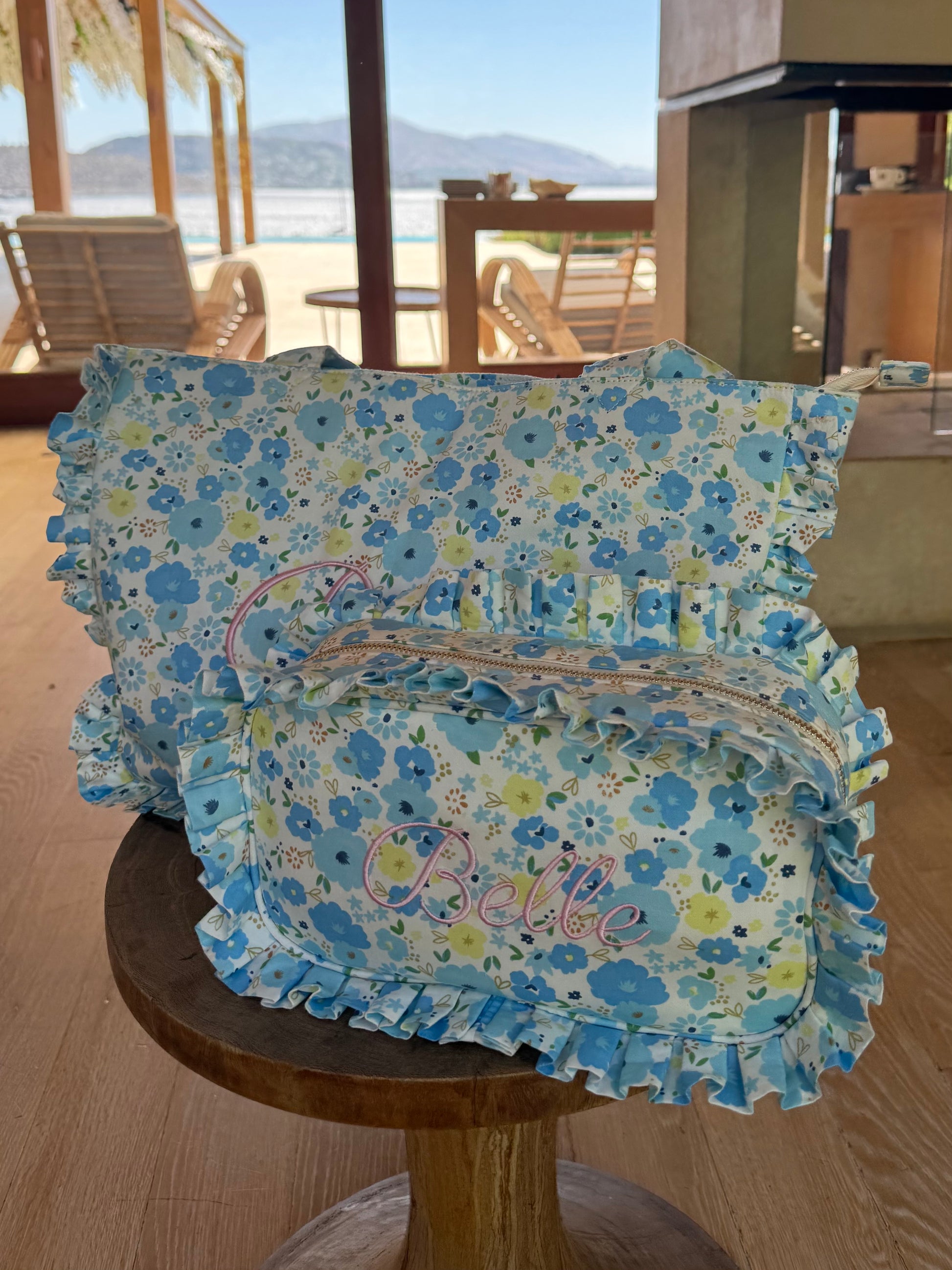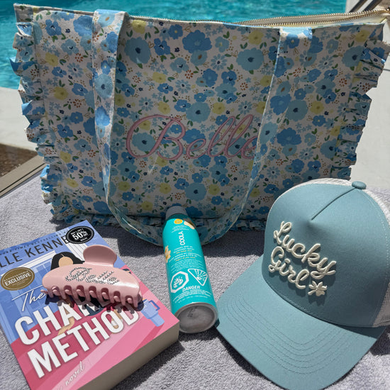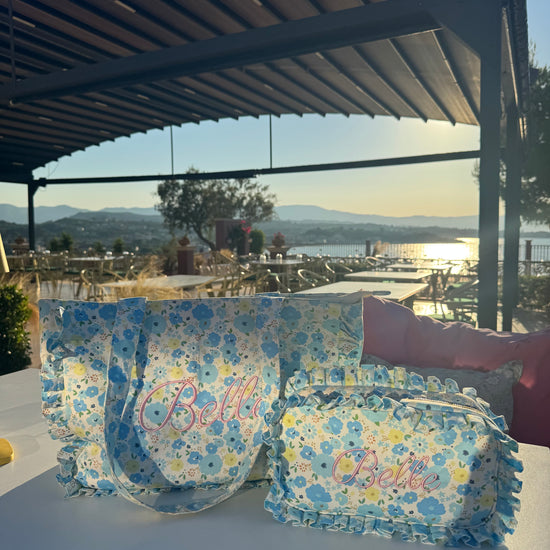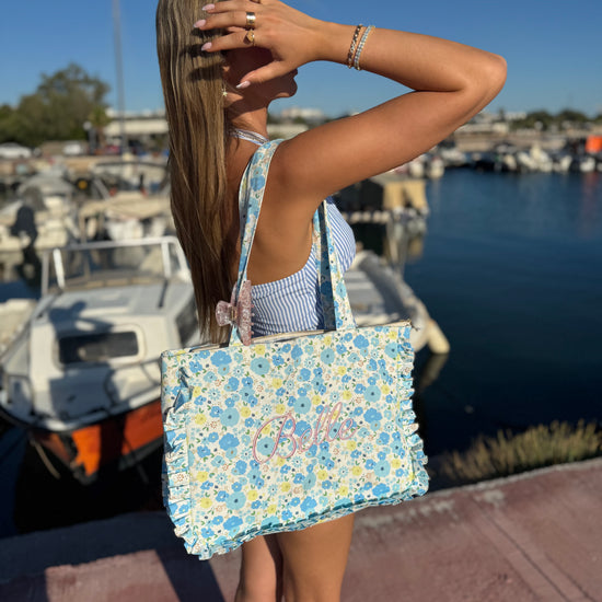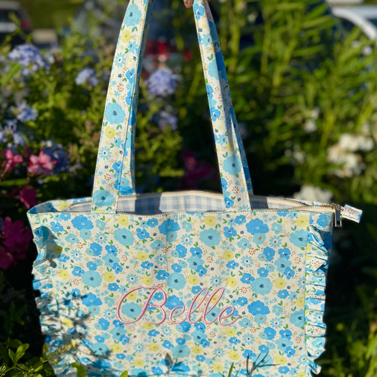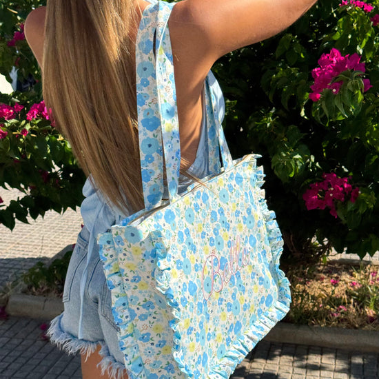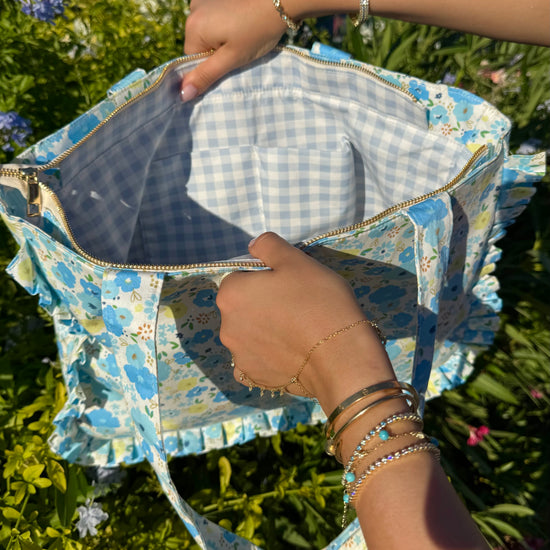 A dreamy floral tote made for market mornings and coastal escapes 💙 This bag matches our Milos Makeup Bag and brings the same island-inspired charm in a larger, everyday carry-all. Lightweight, roomy, and finished with delicate ruffle trim, a zipper top, and a blue gingham plaid interior, it’s perfect for your laptop, beauty pouches, or beach day must-haves.