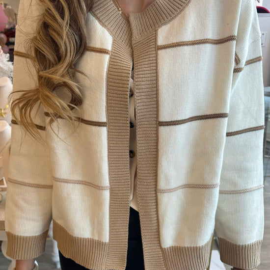 This cardigan is crafted in beautiful, neutral tones of beige, offering a soft and luxurious feel. With its stunning sand-colored border, cuffed sleeves, and ribbed collar, it's the perfect combination of elegance and comfort. You'll fall in love with its cozy, high-quality texture and timeless design.