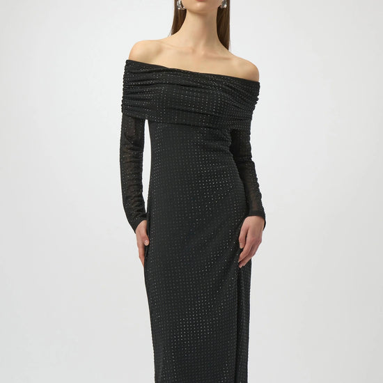 This sheath dress exudes sophistication, featuring all-over black rhinestones that catch the light beautifully. The off-shoulder design adds a hint of mystique, while long sleeves and an ankle-grazing silhouette create an elegant, streamlined look.