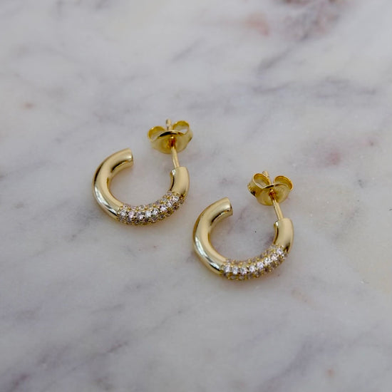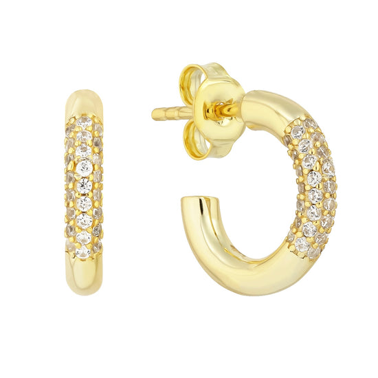 A classic shape with a radiant twist. These chic hoops feature a row of shimmering pavé CZ stones that fade into high-polish 14K gold vermeil, all crafted on a 925 sterling silver base. Lightweight with a luxe feel, they’re perfect for everyday glam or dressing up your night-out look.