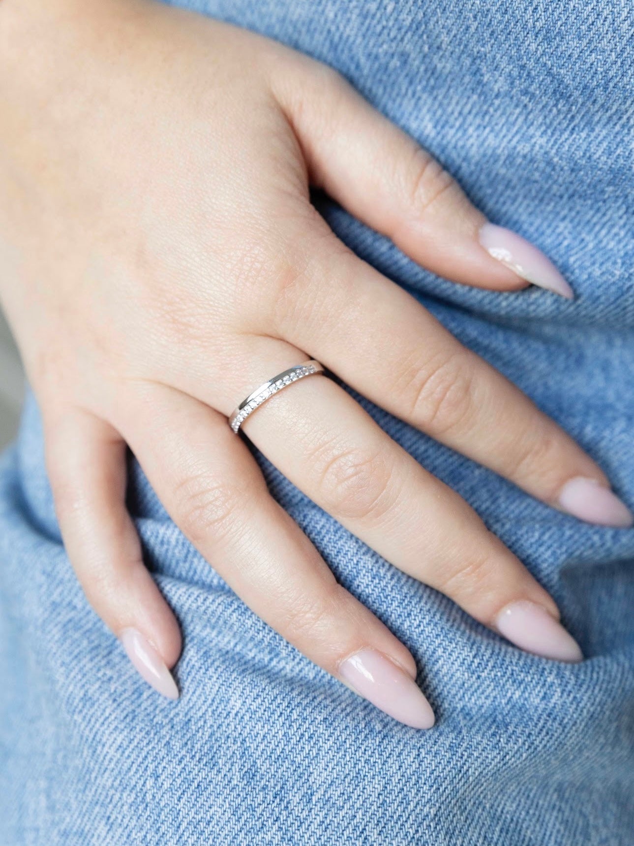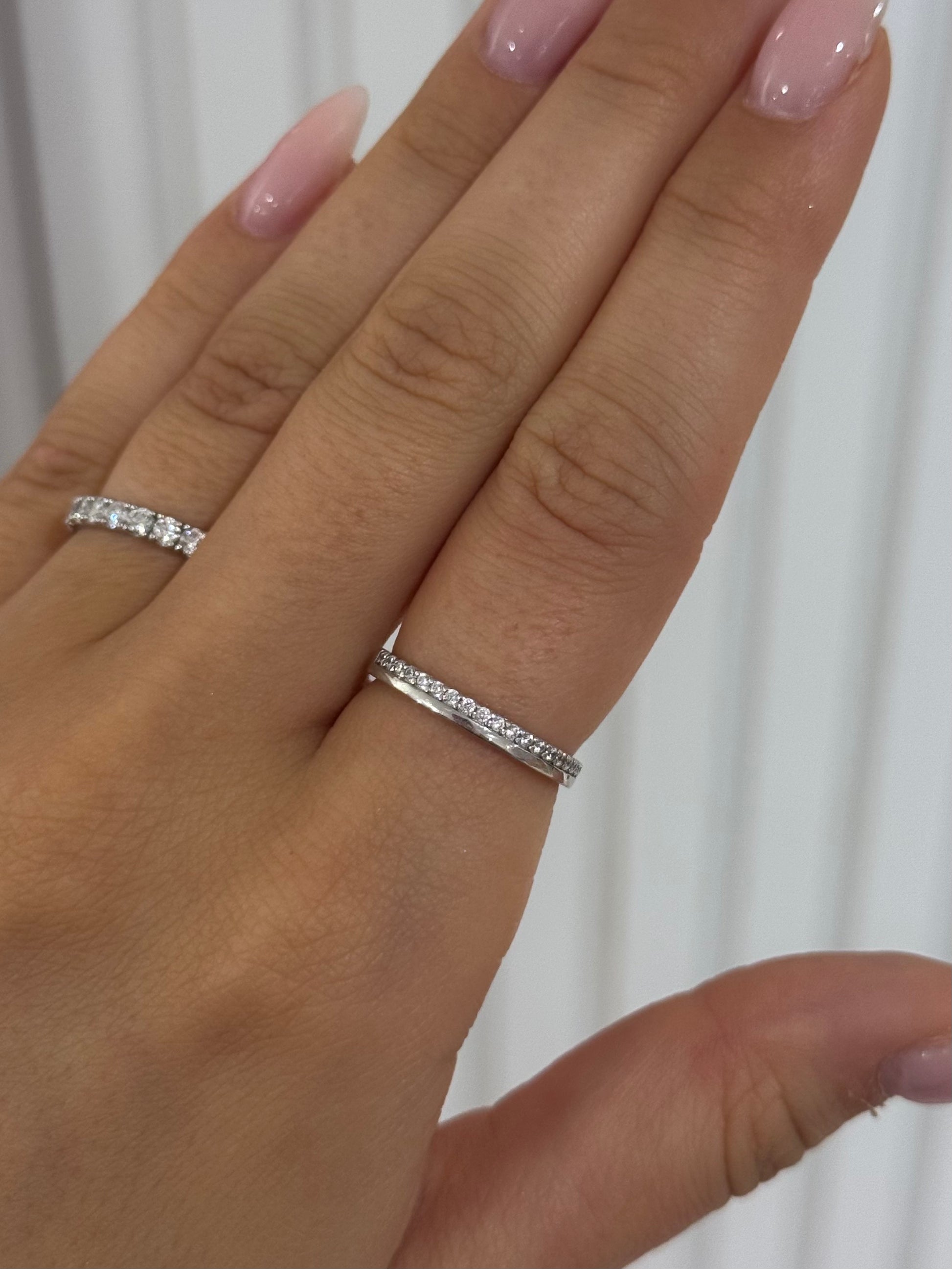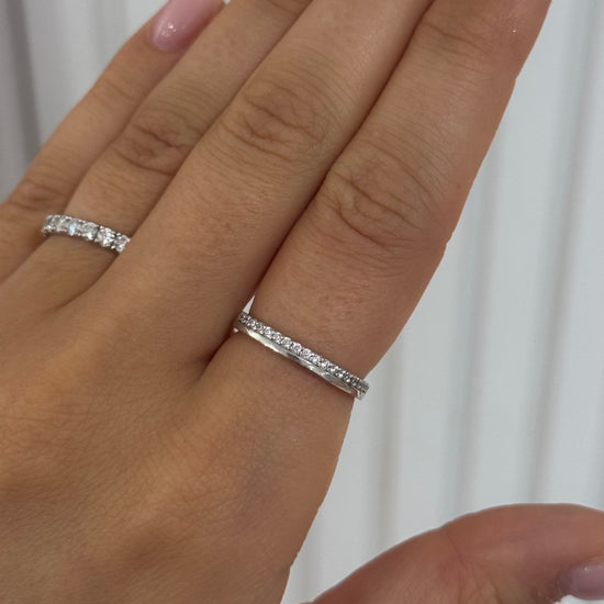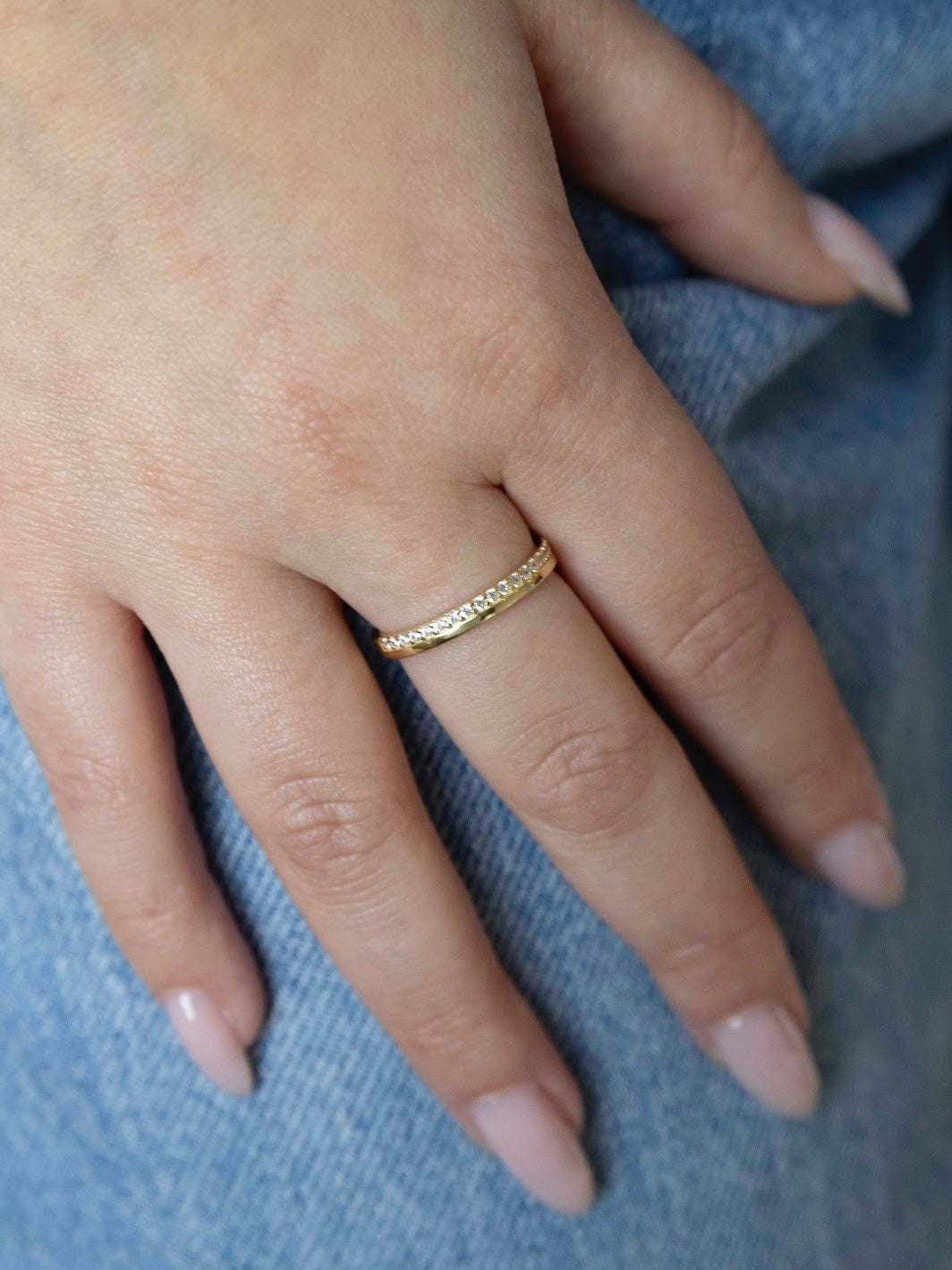 These delicate pavé stacking bands feature sparkling CZ accents in rhodium and 14k gold vermeil over a base of 925 sterling silver. Perfect for everyday wear, they’re beautiful worn solo or stacked together for a layered look.