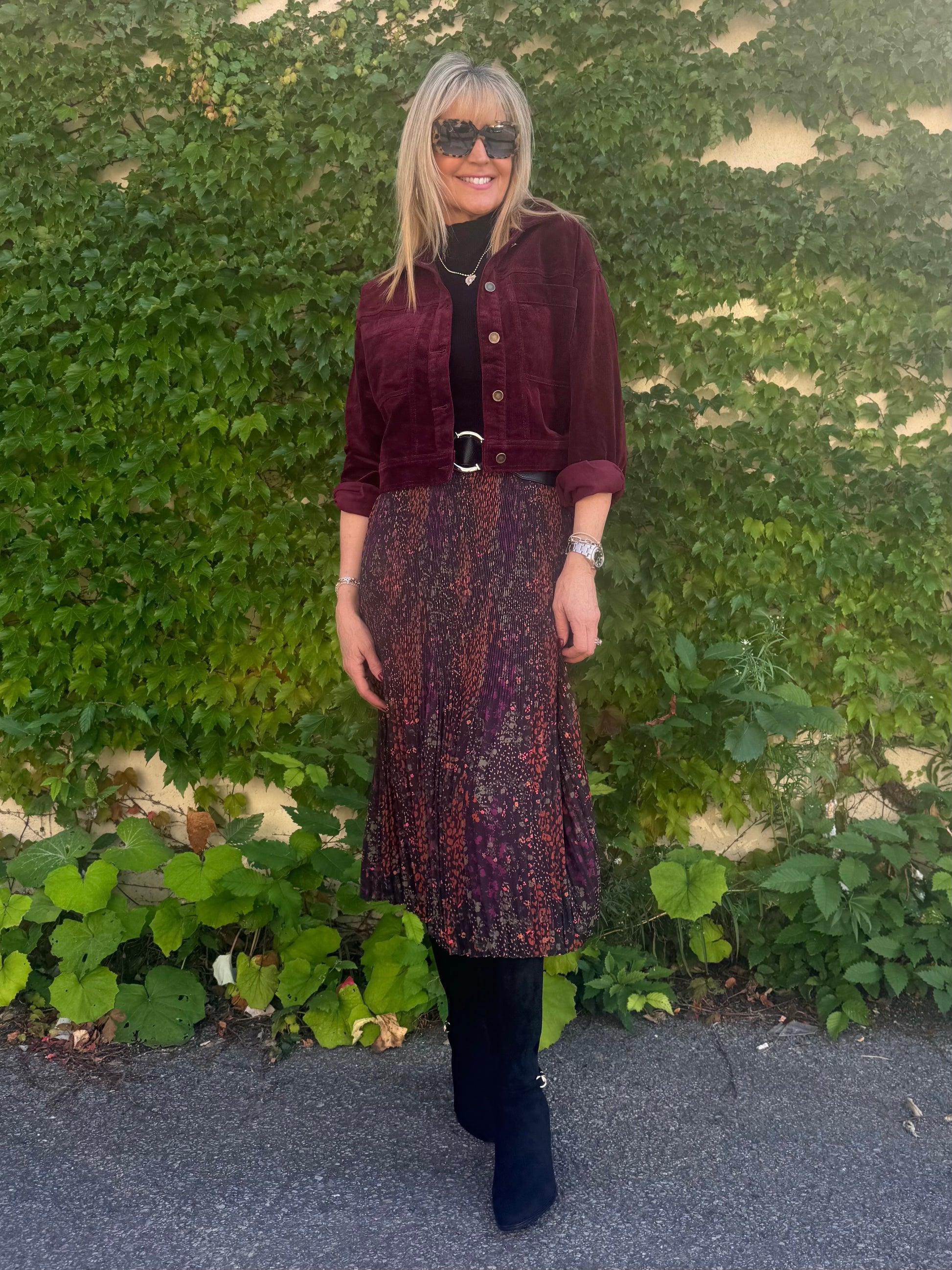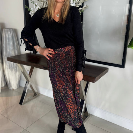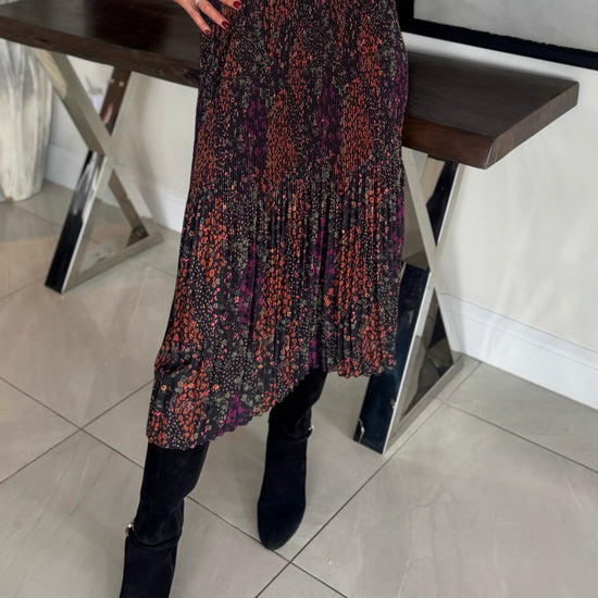 Move with ease in a skirt crafted from printed crepe fabric, featuring a flowy plissé design that creates graceful, rippling movement. A 32'' length offers elegant coverage, while a slit accent adds fluidity and a touch of allure.