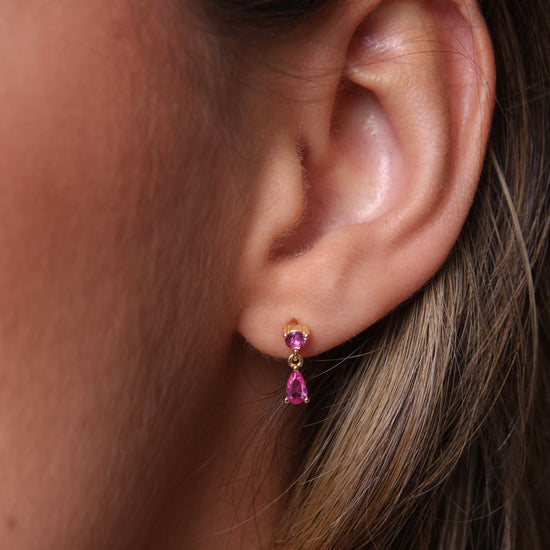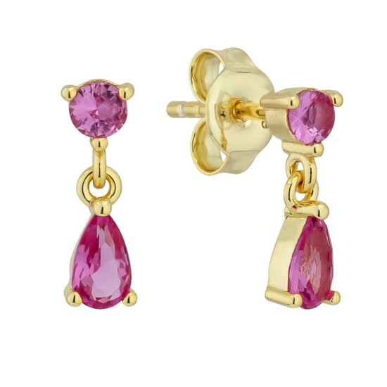 Delicate and dazzling, these earrings feature a vibrant round and pear-cut pink CZ duo, set in rich 14K gold vermeil. Crafted on a 925 sterling silver base with butterfly backings, they bring just the right touch of sparkle and femininity. Perfect for a pop of color in your everyday or a soft statement for special nights.