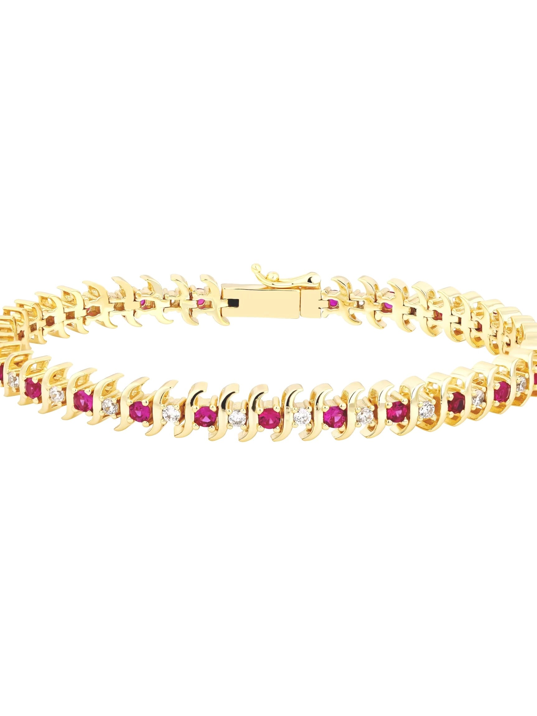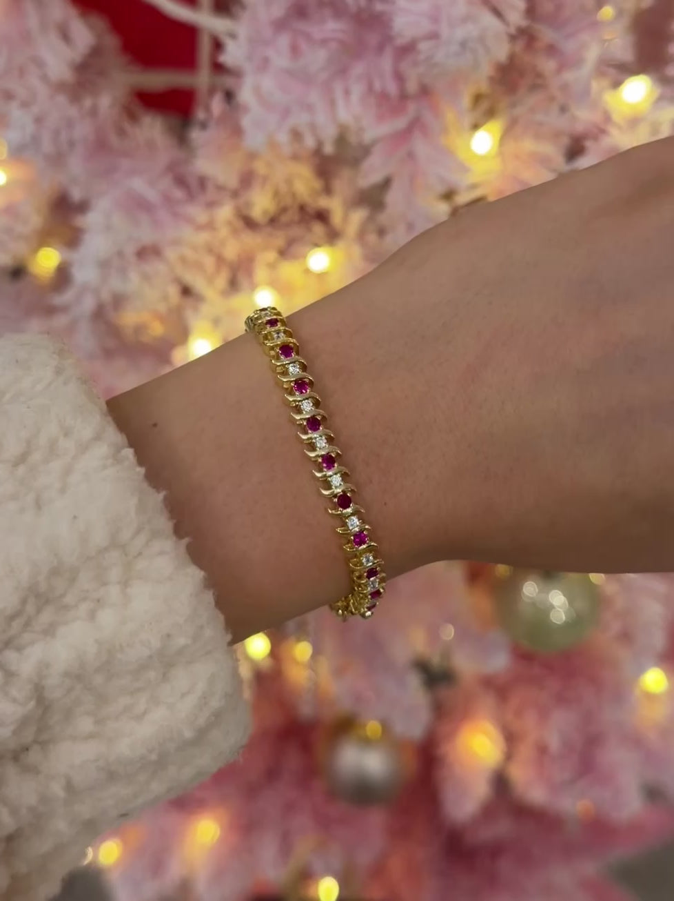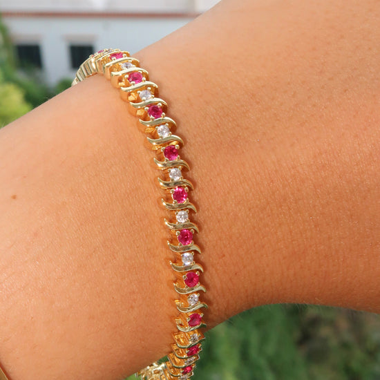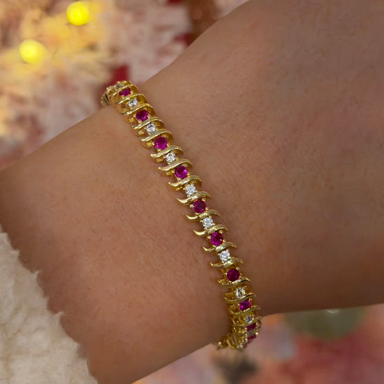 crafted with soft s-shaped links and alternating ruby cz + clear cz stones, this dreamy piece flows like a wave — delicate, feminine, and just bold enough. made with 14k gold vermeil, she’s the perfect statement for your everyday stack.