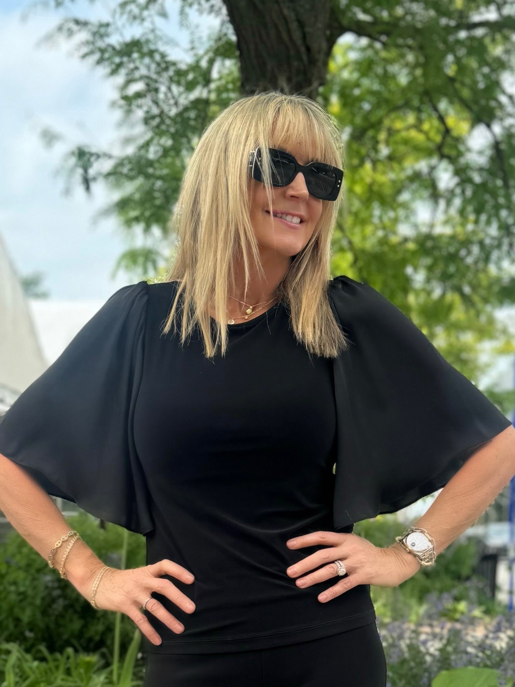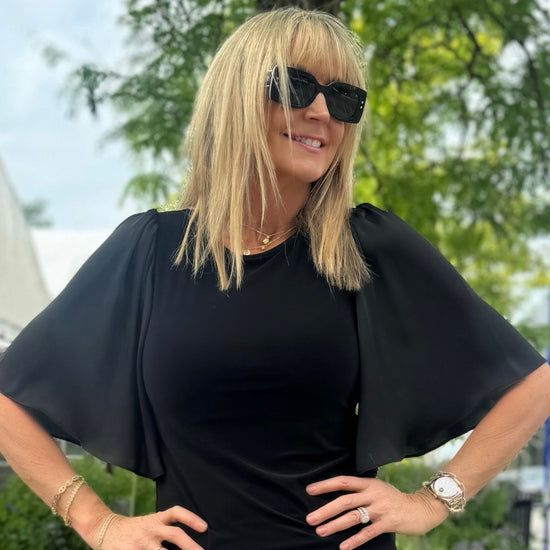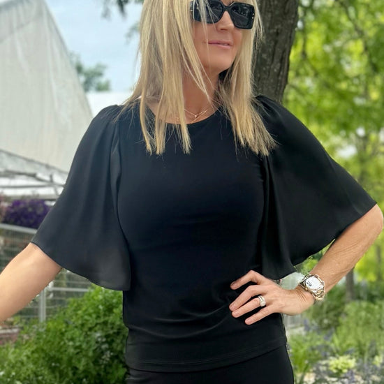 Revel in the finesse and simplicity of this silky knit top. The classic straight silhouette can easily be dressed up or down to fit any occasion or attire. The sleek crew neck and satin ruffled sleeves add character to this wardrobe staple.