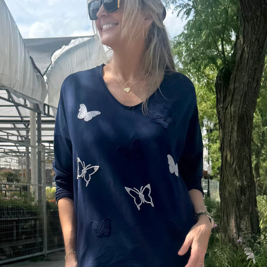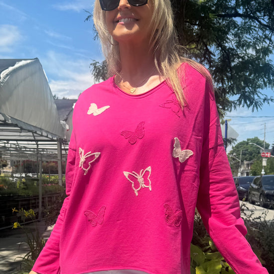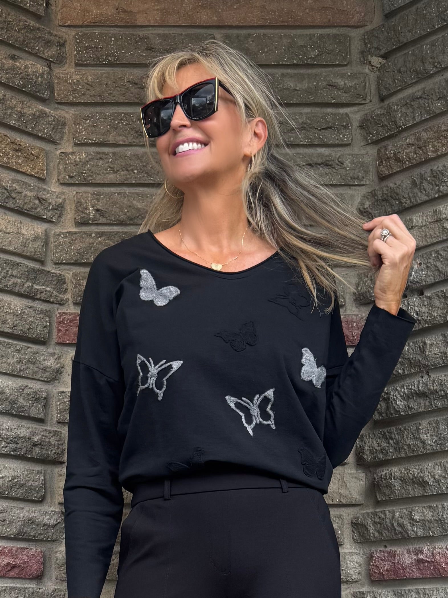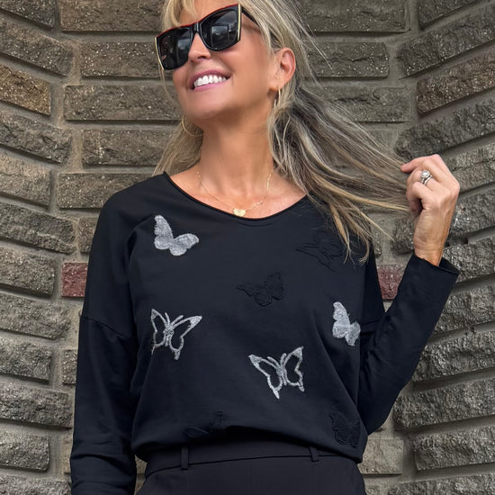 This lightweight, soft long-sleeve top is crafted from 95% cotton for ultimate comfort. Featuring a unique 3D butterfly design, a flattering V-neckline, and raw-edge sleeve detailing, it blends artistic flair with modern style. Made in Italy, this piece offers both elegance and durability for everyday wear.