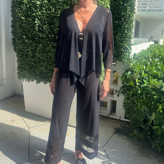 Step into effortless sophistication with these ultra-modern wide-leg pants. Designed with a striking double-band mesh insert at the hem, they add just the right touch of edge while maintaining a sleek, refined silhouette. The fluid wide-leg fit moves beautifully with you, instantly elevating any outfit. Style them with a fitted top and clean, minimalist accessories for a look that’s chic, contemporary, and confidently put-together.