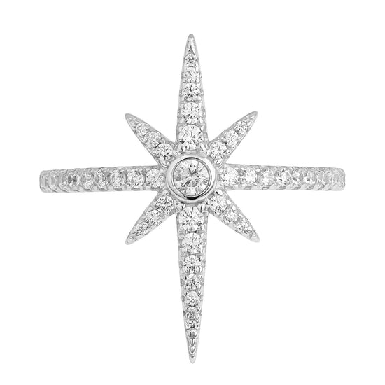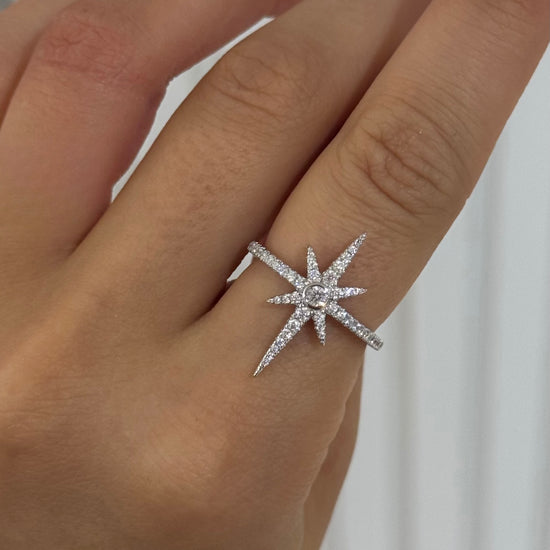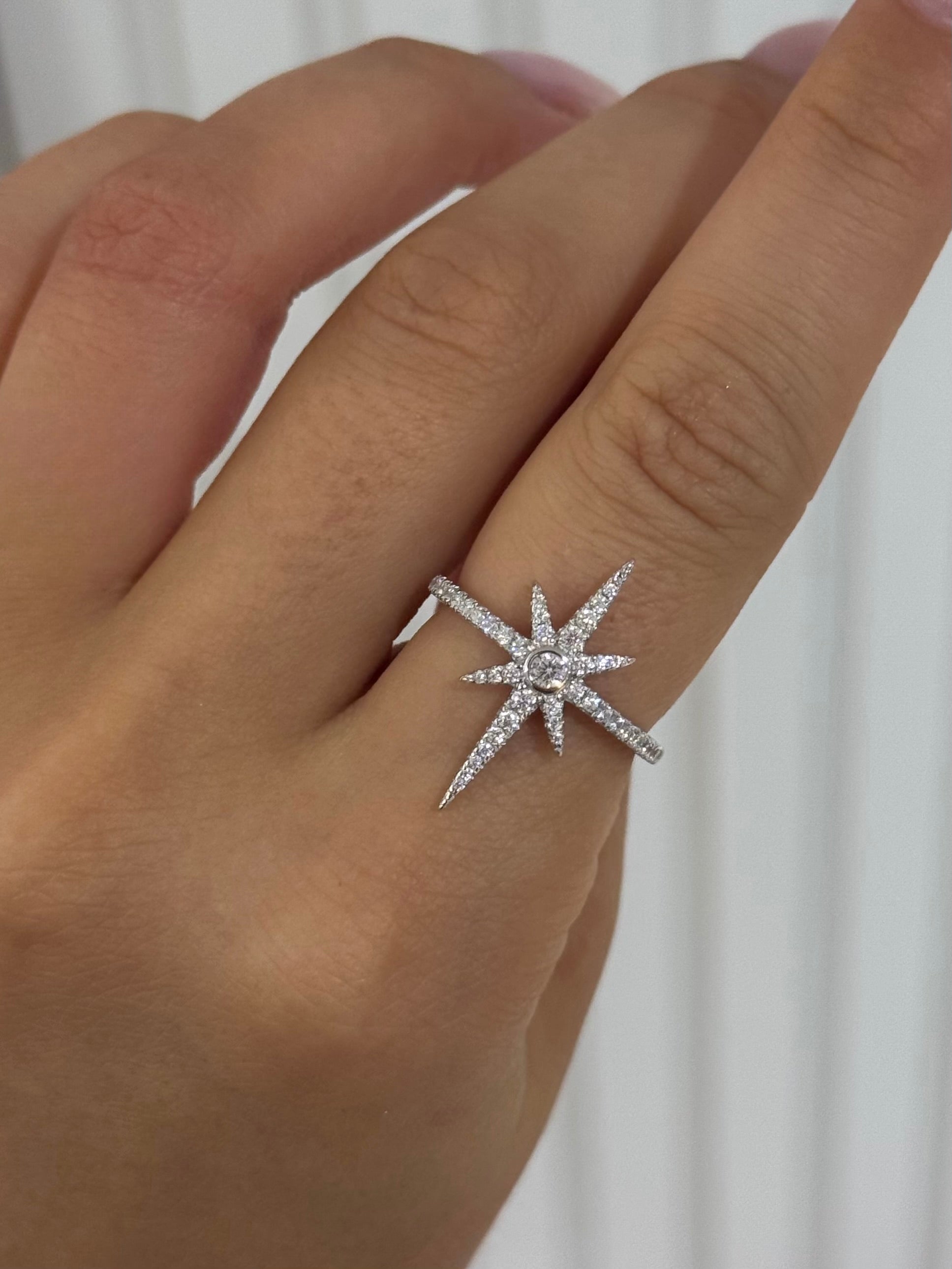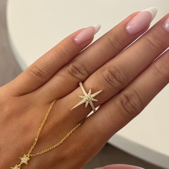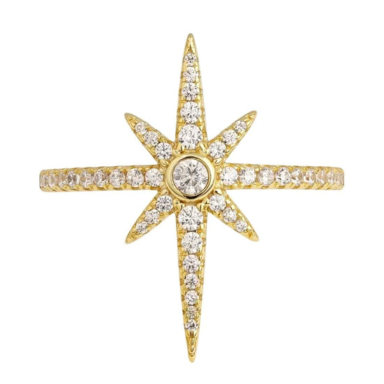The Stella Ring is your golden reminder to shine bright. Featuring a starburst design encrusted in micro CZ stones and set on a delicate pavé band, this ring gives radiant, night-sky energy from every angle.