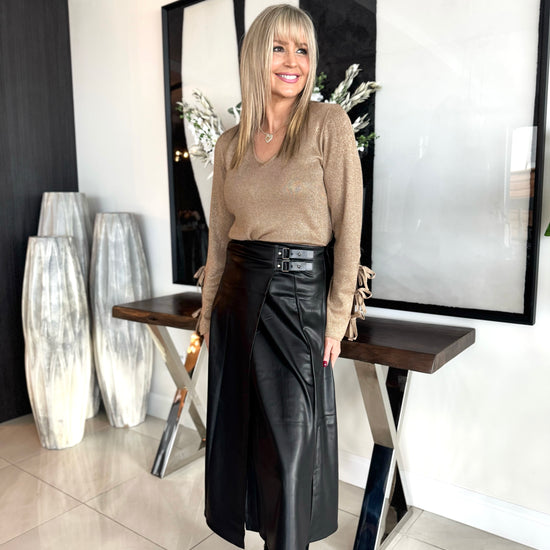 Embrace effortless style with this sleek and chic vegan leather skirt. With its flattering A-line silhouette, it offers a perfect balance of structure and flow, making it a wardrobe essential. The standout feature? The edgy gold buckle detail that adds an extra touch of sophistication and flair. Designed to mimic a wrap skirt, this piece brings both modern and timeless appeal, making it an ideal choice for any occasion.