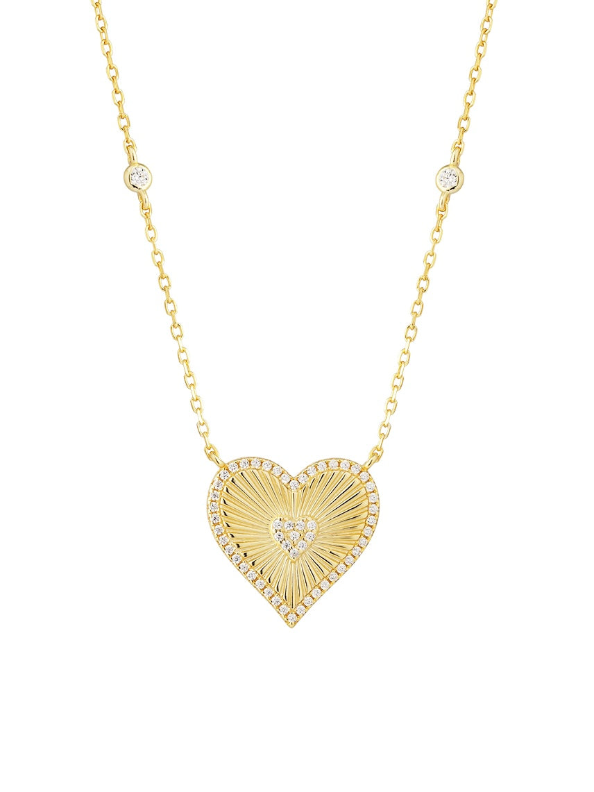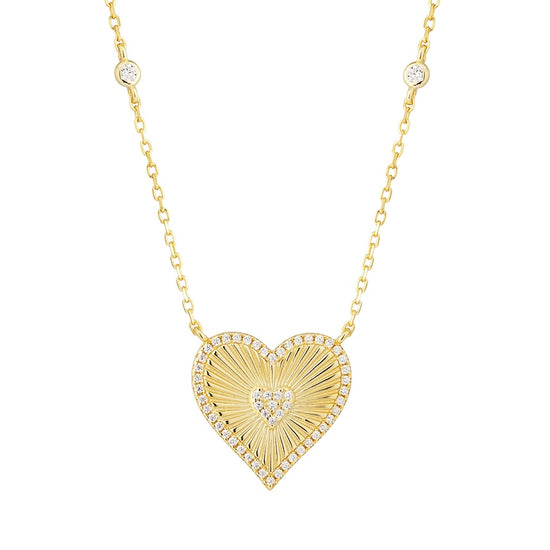 Features a radiant 18mm heart pendant with sunburst detailing, a pavé CZ border, and a sparkling center heart for that extra main character energy. Suspended on a delicate chain with inset CZ stones — it’s giving golden hour romance.