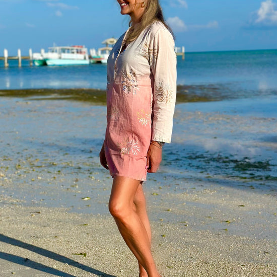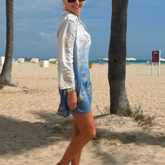 This beautiful piece features intricate embroidery and delicate beaded details that instantly elevate your look. Designed with a flattering V-neckline, subtle button accents, and a chic mandarin collar, it offers the perfect balance of elegance and ease. The stunning ombré colour adds soft dimension, while the 100% cotton fabric keeps it breathable, lightweight, and comfortable all day long. Wear it as a stylish cover-up by the pool or beach, or dress it up as a tunic for an effortless day-to-night outfit.