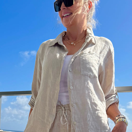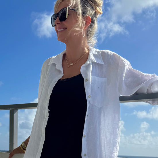 Effortless, breathable, and timeless. This Made in Italy linen button-down top is a must-have for warm-weather style. Made from lightweight linen, it offers a relaxed silhouette that keeps you cool while looking effortlessly chic. Designed with a classic collar, front button closure, and a chest pocket, this versatile piece can be worn buttoned up or layered open over a tank or dress. The slightly longer curved hem in the back adds a flattering and modern touch.