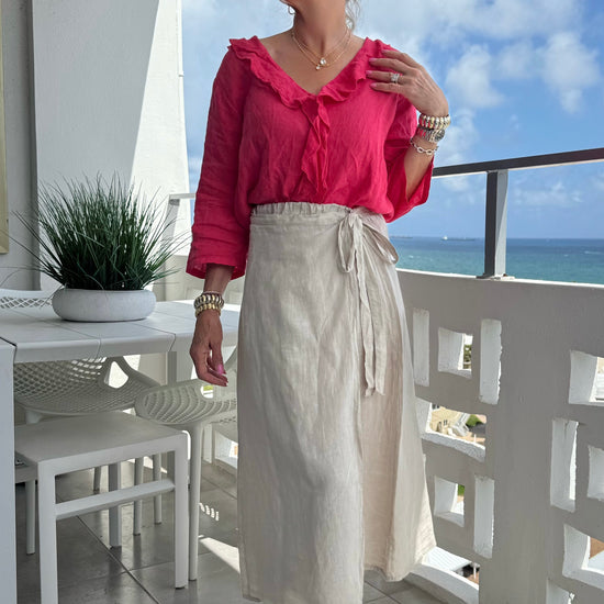 Effortlessly stylish and perfect for warm days, this Made in Italy linen wrap dress combines comfort with timeless elegance. Mace from breathable linen, it keeps you cool while offering a relaxed, flattering silhouette. Designed with a wrap-style front and a feminine bow tie detail, this dress allows you to adjust the fit while adding a beautiful touch to the waist. The elasticized waistband provides extra comfort and flexibility, making it easy to wear all day.