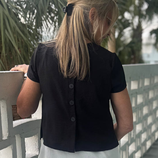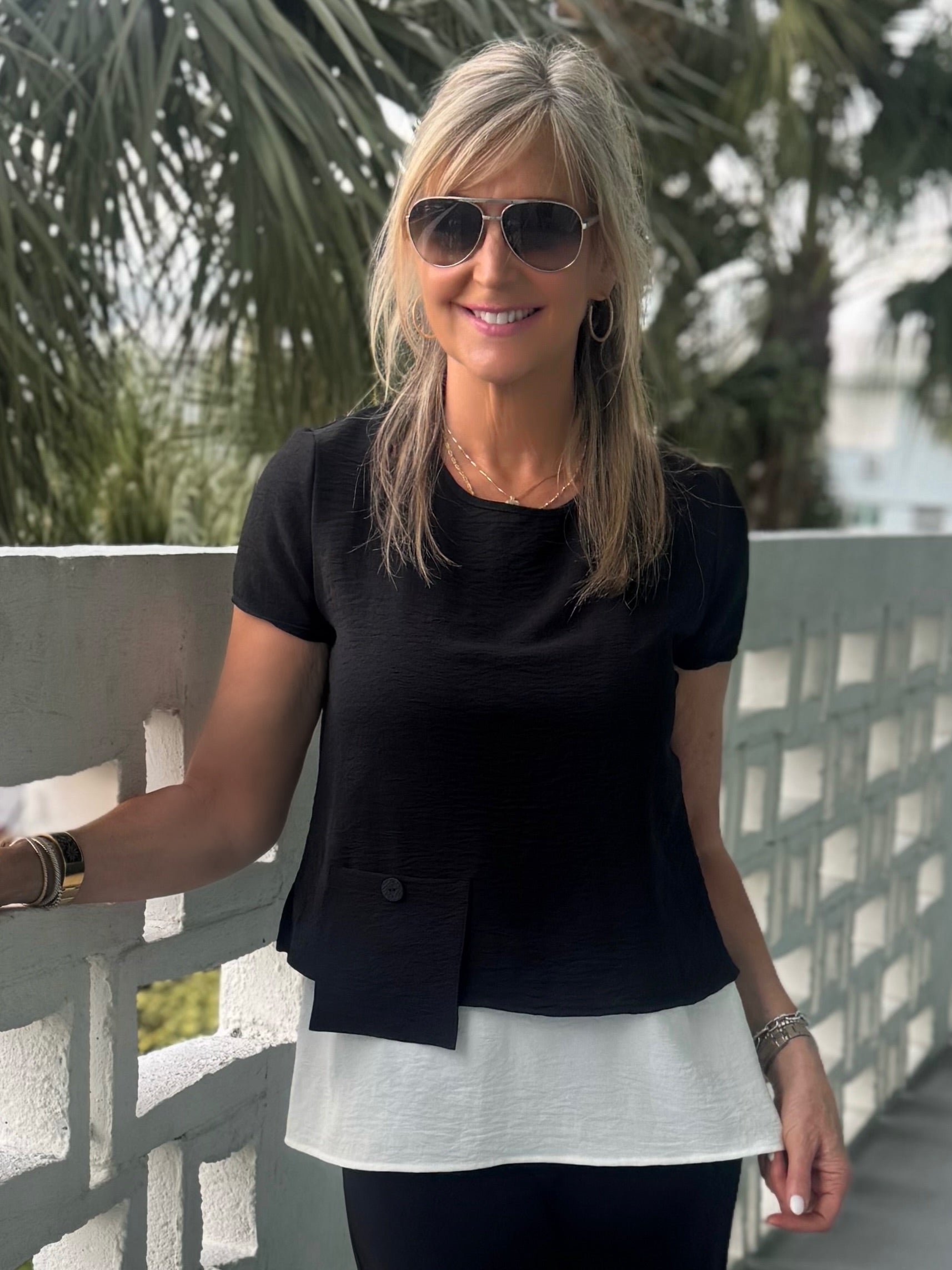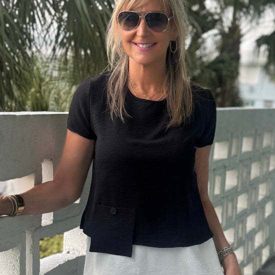 A modern layered look made effortless. This made in Canada two-piece design features a soft inner layer with an asymmetrical ITY overlay that drapes beautifully and moves with you. Made with wrinkle-free ITY fabric, this top is lightweight, stretchy, and incredibly comfortable. Polished enough to dress up, comfortable enough for all-day wear. The unique front detail and subtle pocket add interest, while the back button detail gives it a refined finish. Pre-order for Mid March.