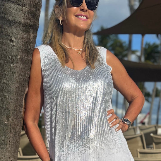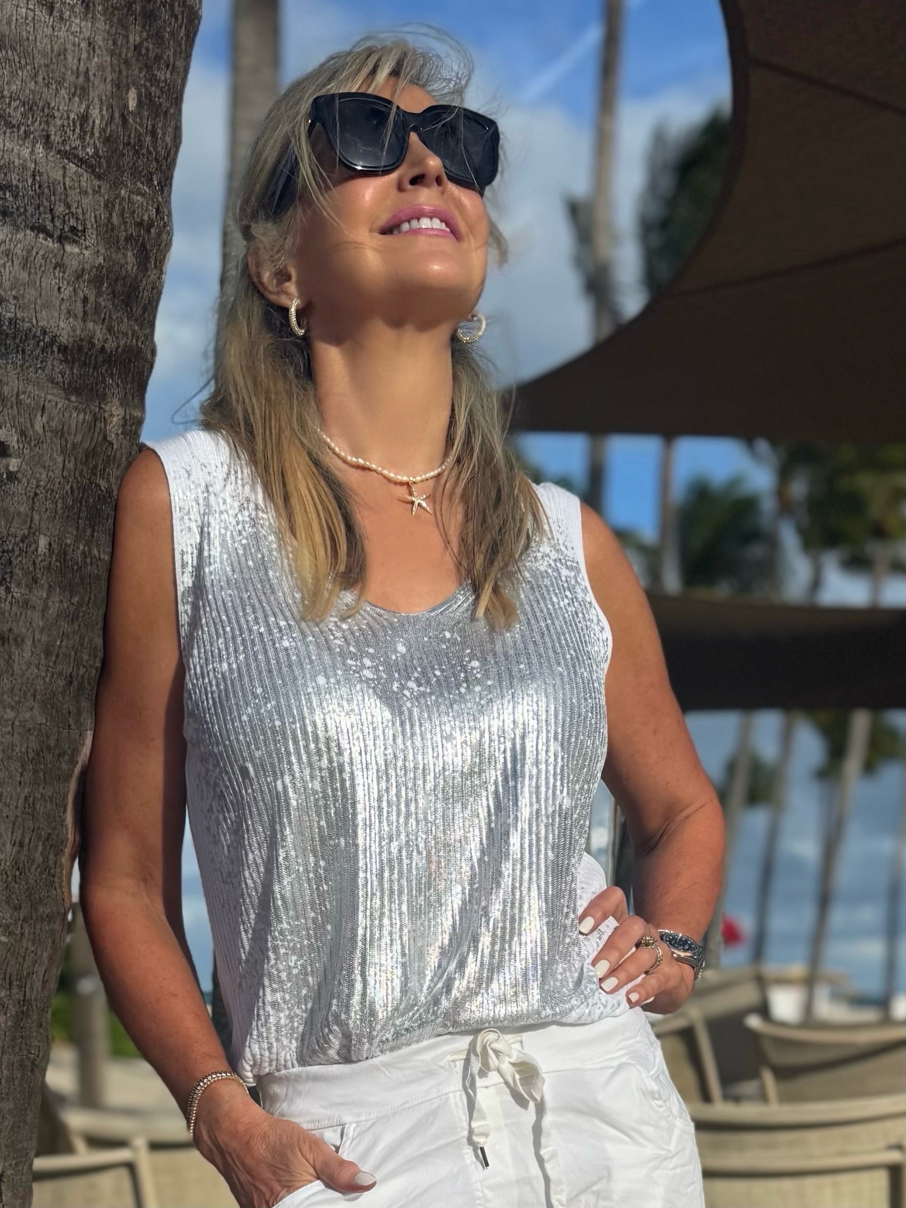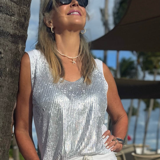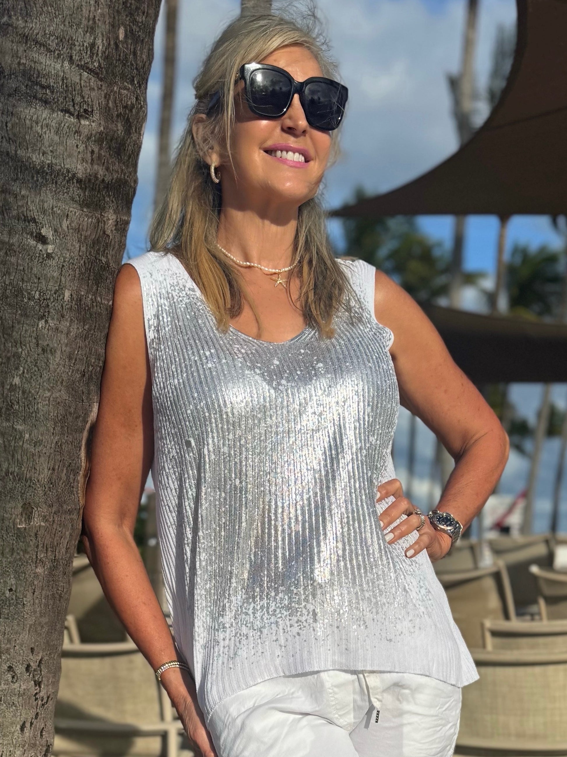 Sleeveless reversible Italian top with a subtle metallic detail on one side and a clean, plain back. Features a soft slight V-neck and an easy, flattering fit. A true four-season piece. Effortless to dress up or down. SOLD OUT IN SAND