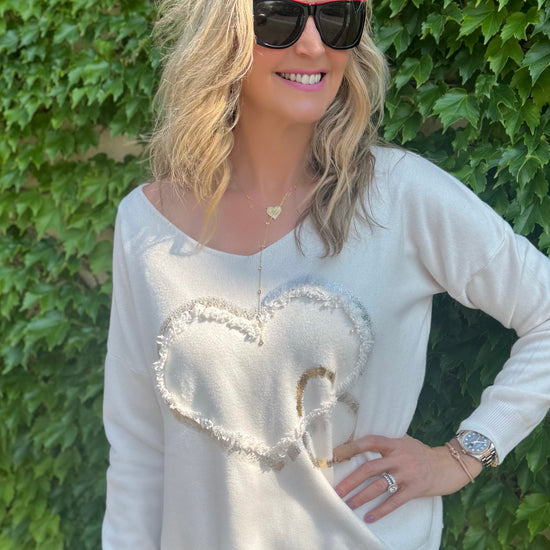 Fall in love with this stunning Italian-made top featuring a metallic heart design with eye-catching gold and silver foil accents and subtle 3D detailing. It has a flattering slight V-neck and full-length sleeves, making it the perfect elevated basic for any wardrobe. Dress it up or down, this top adds a touch of charm and shimmer to any look!