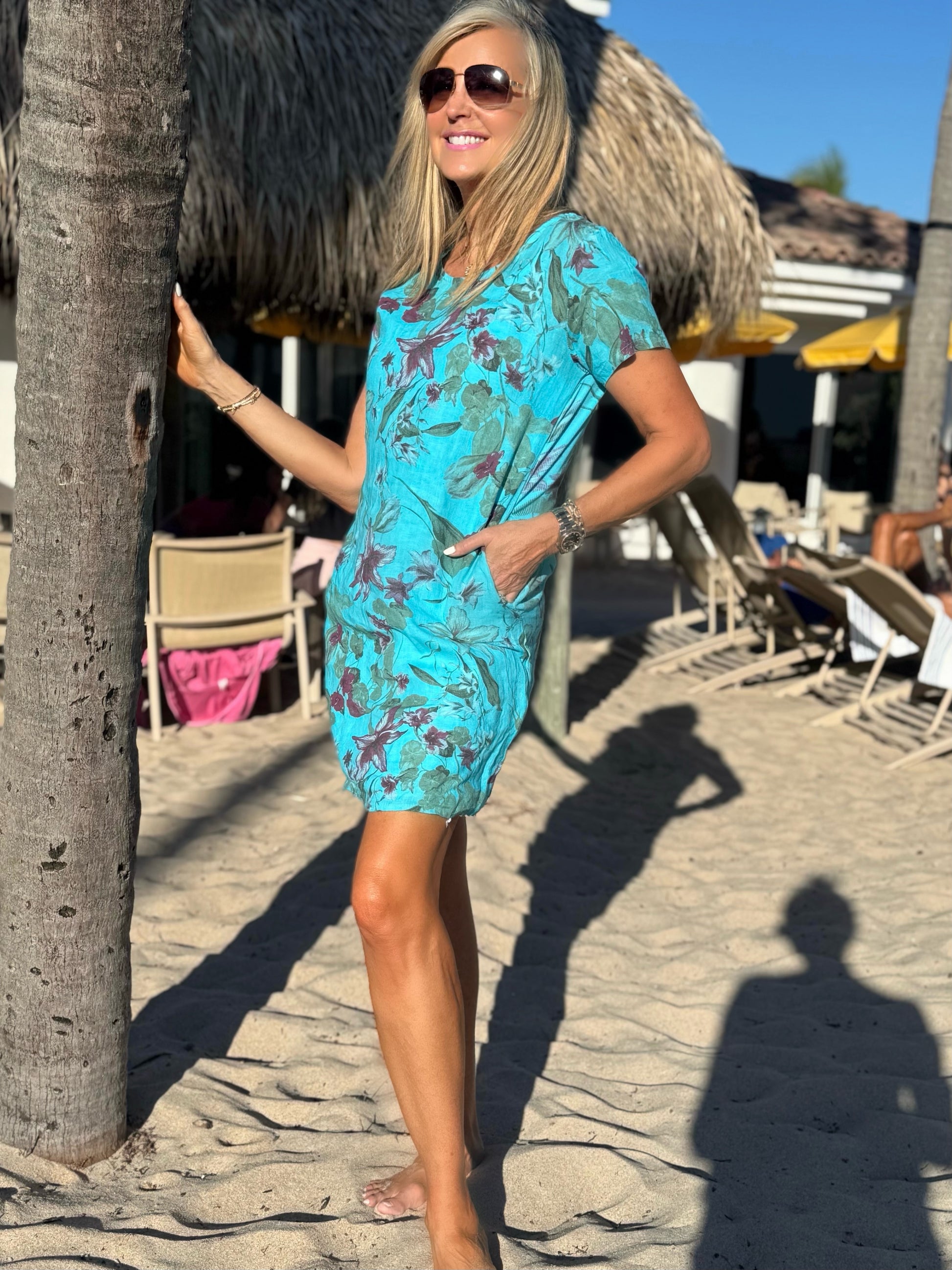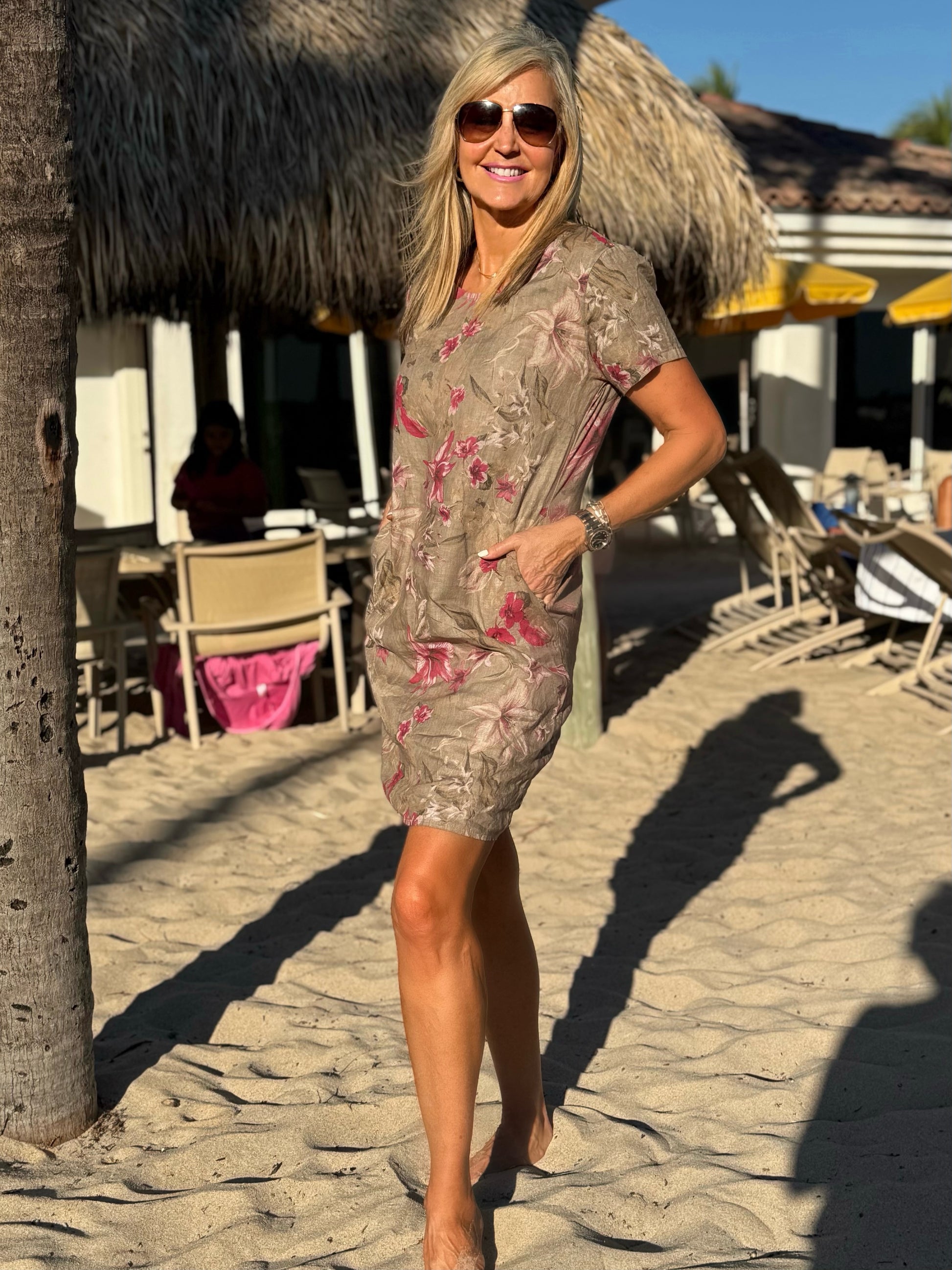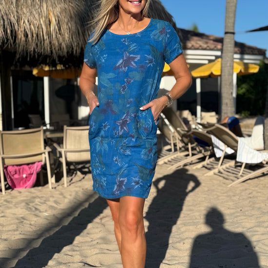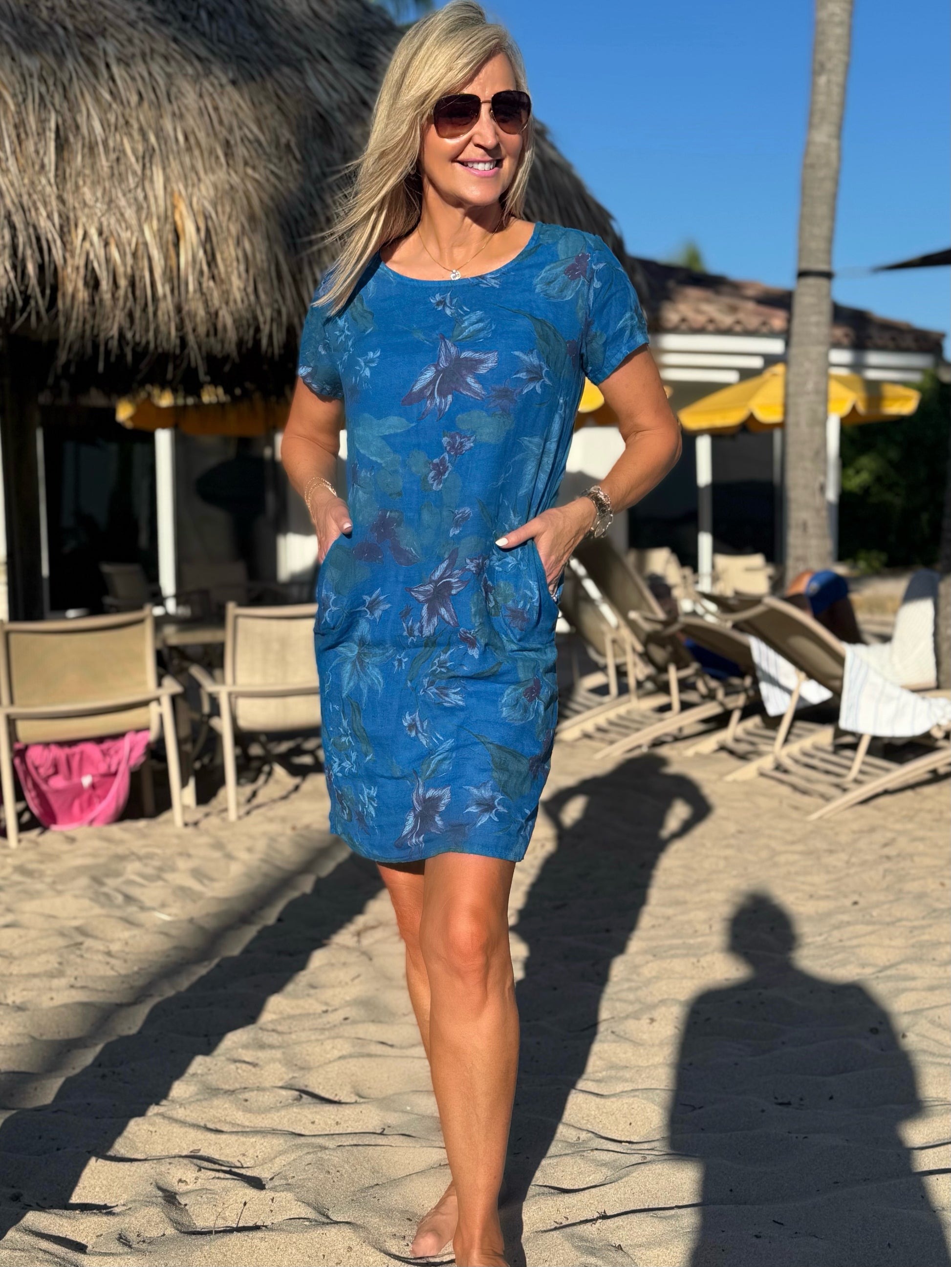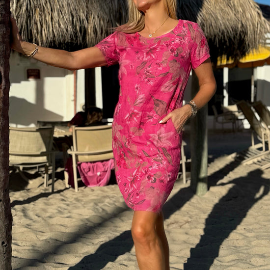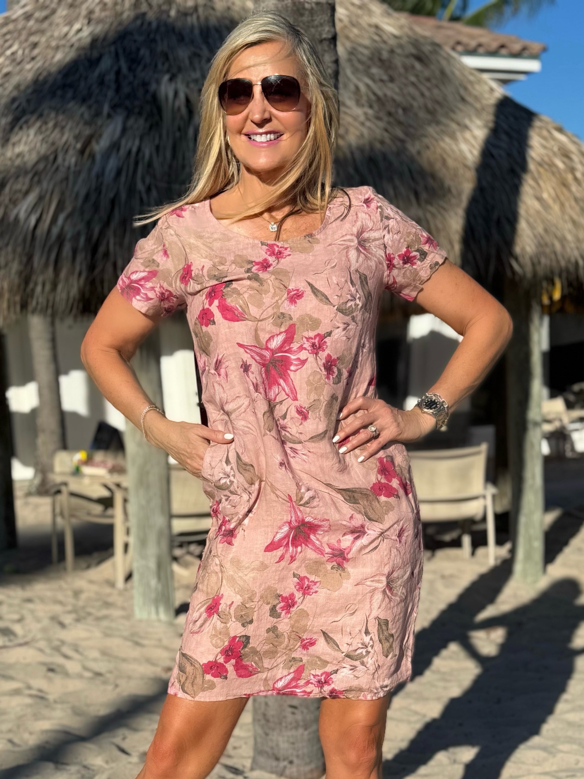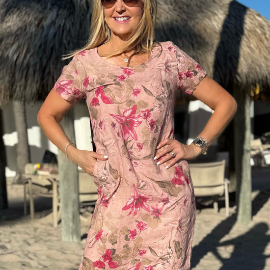 Effortlessly chic and made for warm, sunny days, this Italian linen dress blends comfort with timeless style. Crafted from lightweight, breathable linen, it features a soft floral print and a relaxed silhouette that flatters without clinging. Designed with an easy pull-on fit and functional side pockets, this dress is perfect for vacations, casual outings, or elevated everyday wear. The natural fabric keeps you cool, while the tailored shape adds just the right amount of polish.