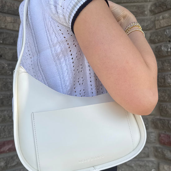 A stunning, high-quality asymmetrical purse made from cruelty-free and vegan recycled leather. It features a silver zipper closure and a small pocket on the back for added convenience.