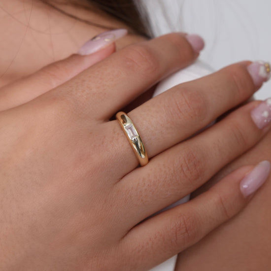 This sleek 14K gold vermeil ring, set on a 925 sterling silver base, features a single baguette-cut CZ stone — like a tiny beam of light captured in gold. Modern, minimal, and endlessly elegant, it’s the kind of piece that whispers luxury in the subtlest way.