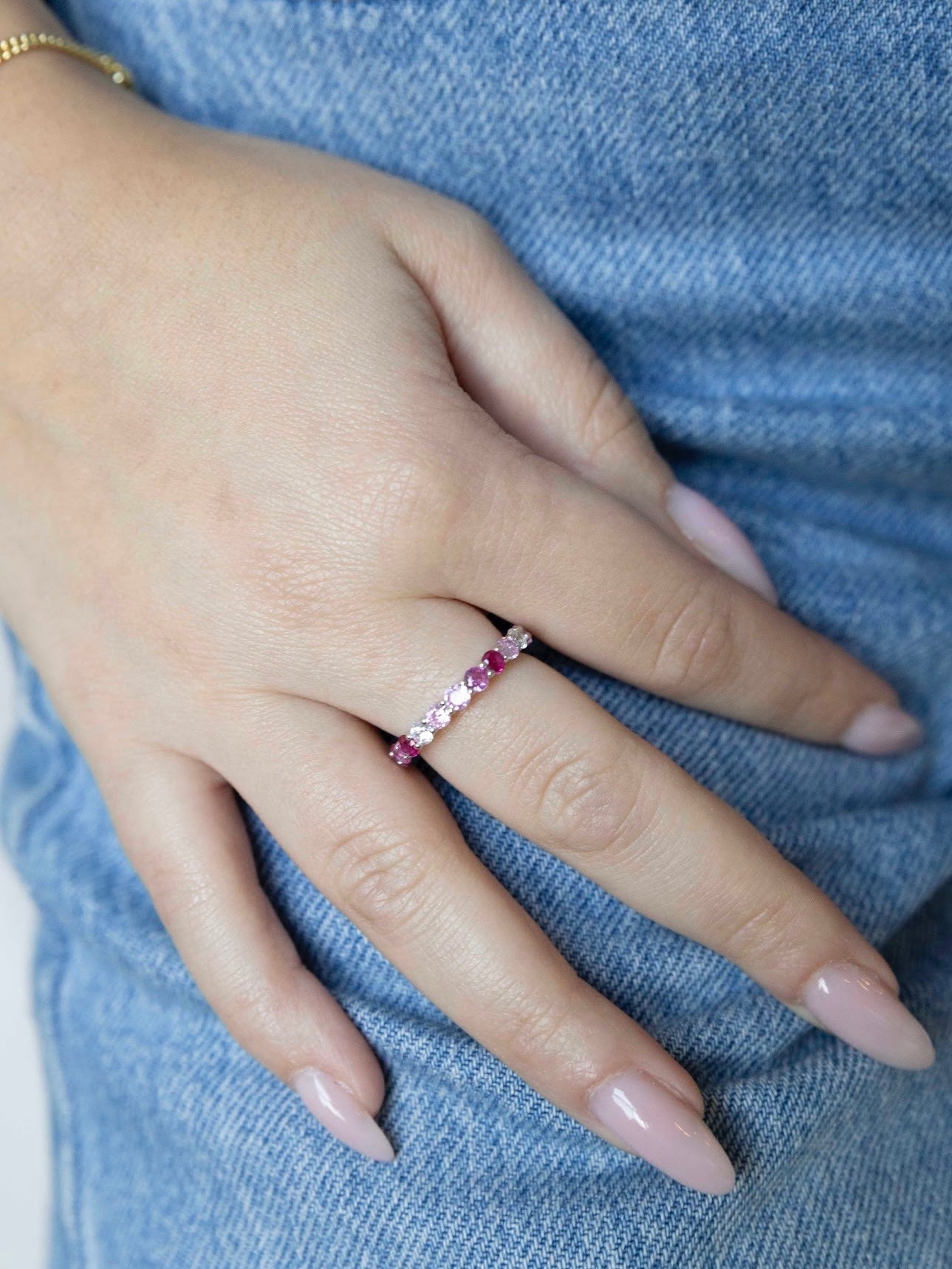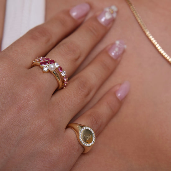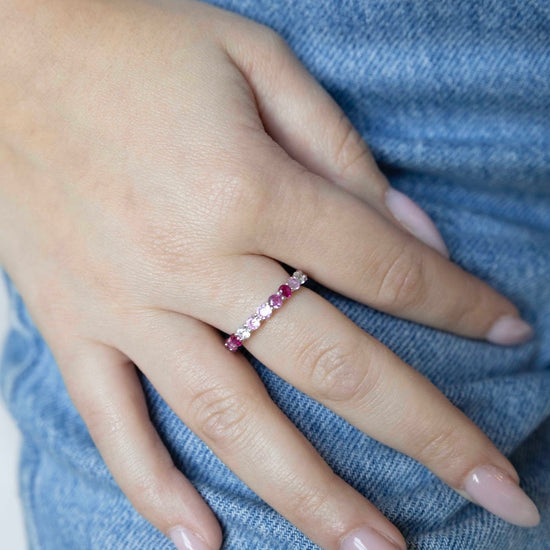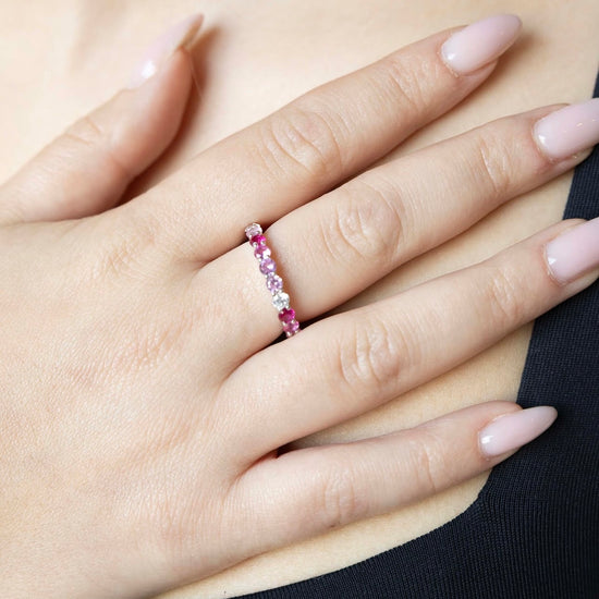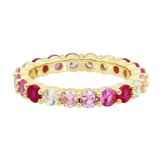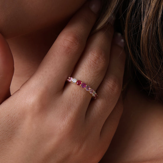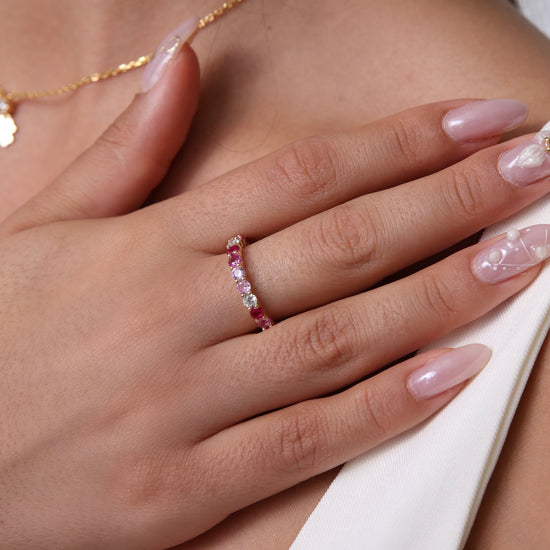 Meet your new statement staple. The Belle Multicolour Ring features a dazzling array of CZ stones in soft pinks, rich reds, and subtle lilacs—set in a 14K gold vermeil band with a sterling silver base. Designed to wrap your finger in color and sparkle from every angle, this eternity-style ring is equal parts romantic and playful. Wear it solo or stacked—either way, she’s a showstopper.