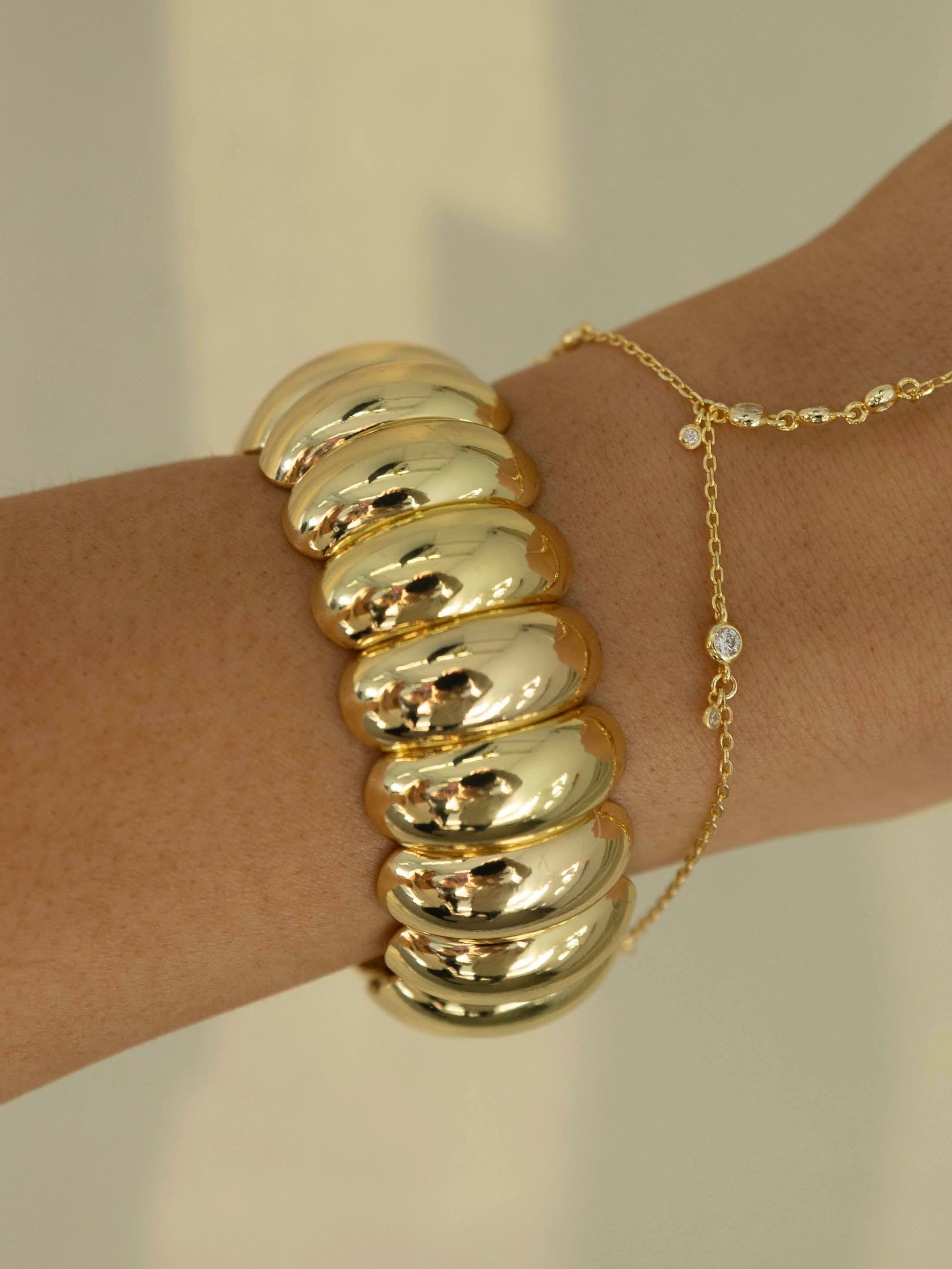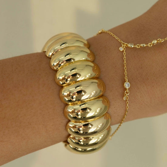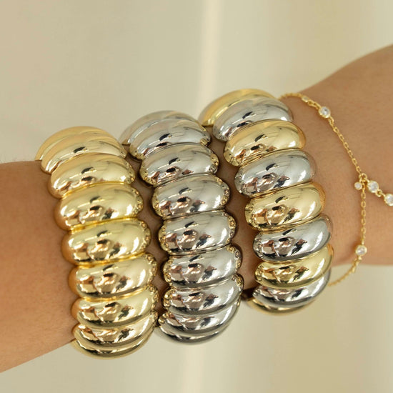 Say hello to your new everyday statement. The Bubble Bangle Bracelet features a bold, glossy bubble design that instantly elevates any look. Designed with a comfortable stretch fit, it slips on effortlessly while giving the illusion of a luxe solid bangle.