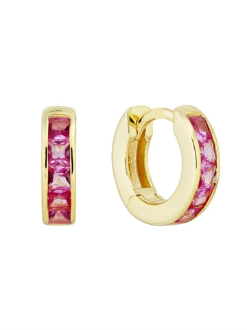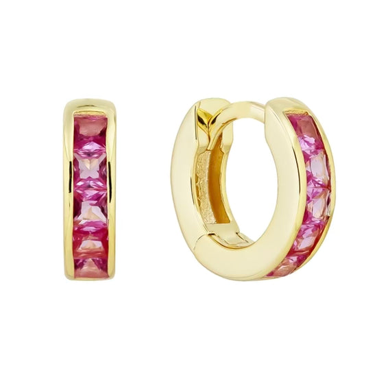 Chic, clean, and kissed with color. These petite huggie hoops feature a channel of princess-cut pink CZ stones set in a sleek 14K gold vermeil band over 925 sterling silver. With their seamless closure and vibrant sparkle, they’re perfect for stacking or making a soft statement on their own.