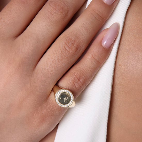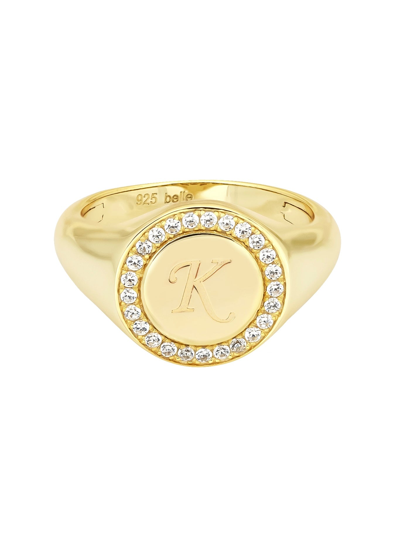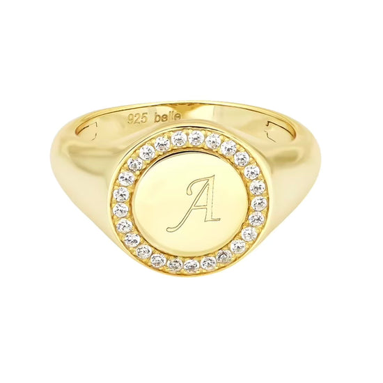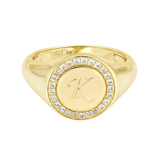 Classic meets custom. This modern signet ring features a sleek, round face engraved with your chosen initial, framed by a halo of brilliant CZ stones. Crafted in 14K gold vermeil over a 925 sterling silver base, it’s the perfect blend of timeless elegance and personal charm. Wear it solo or stack it for a bold, signature look!