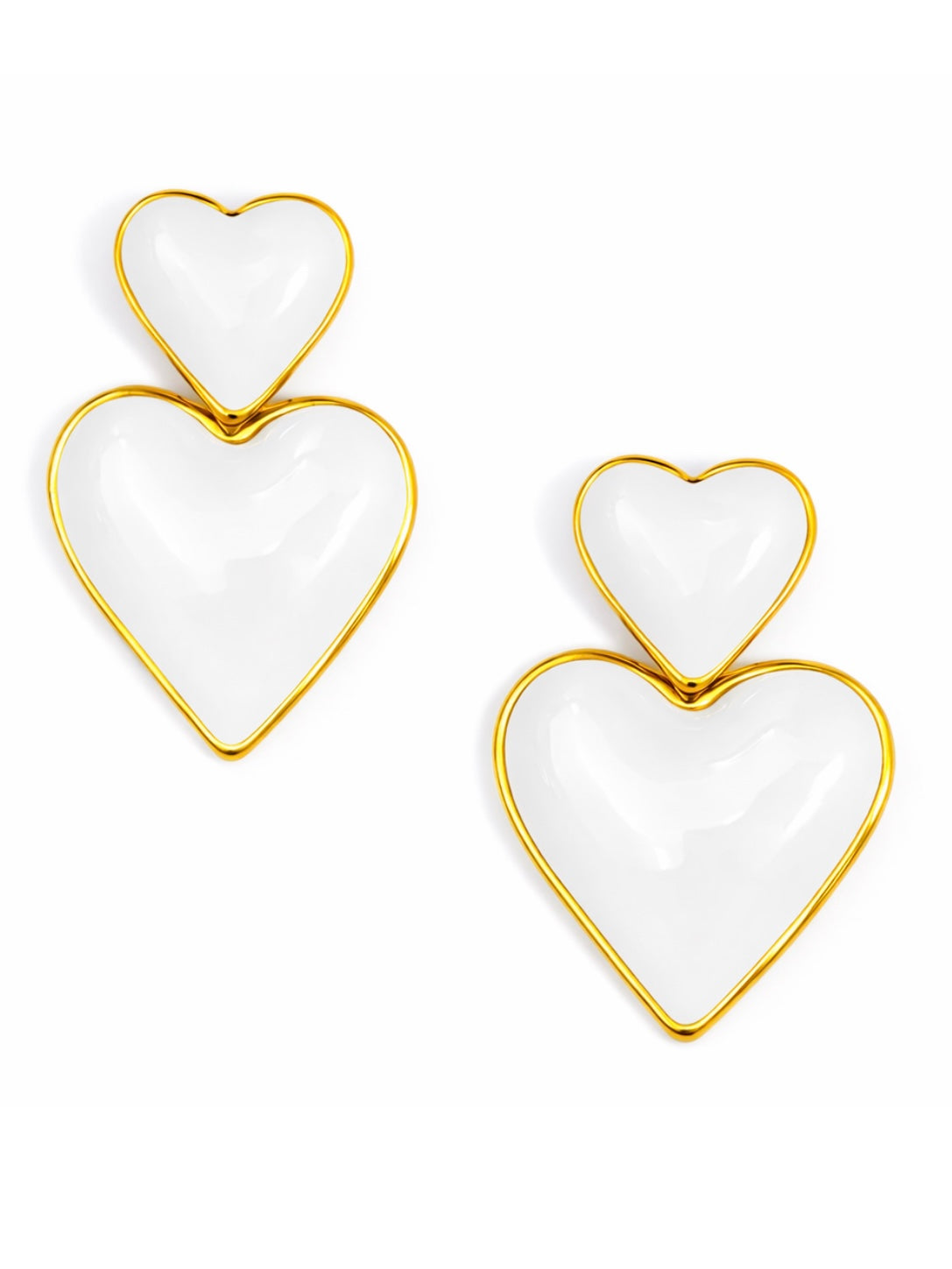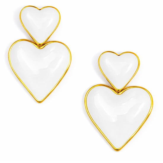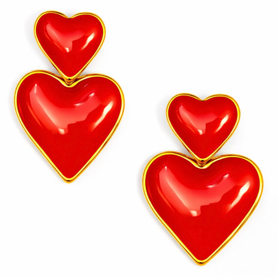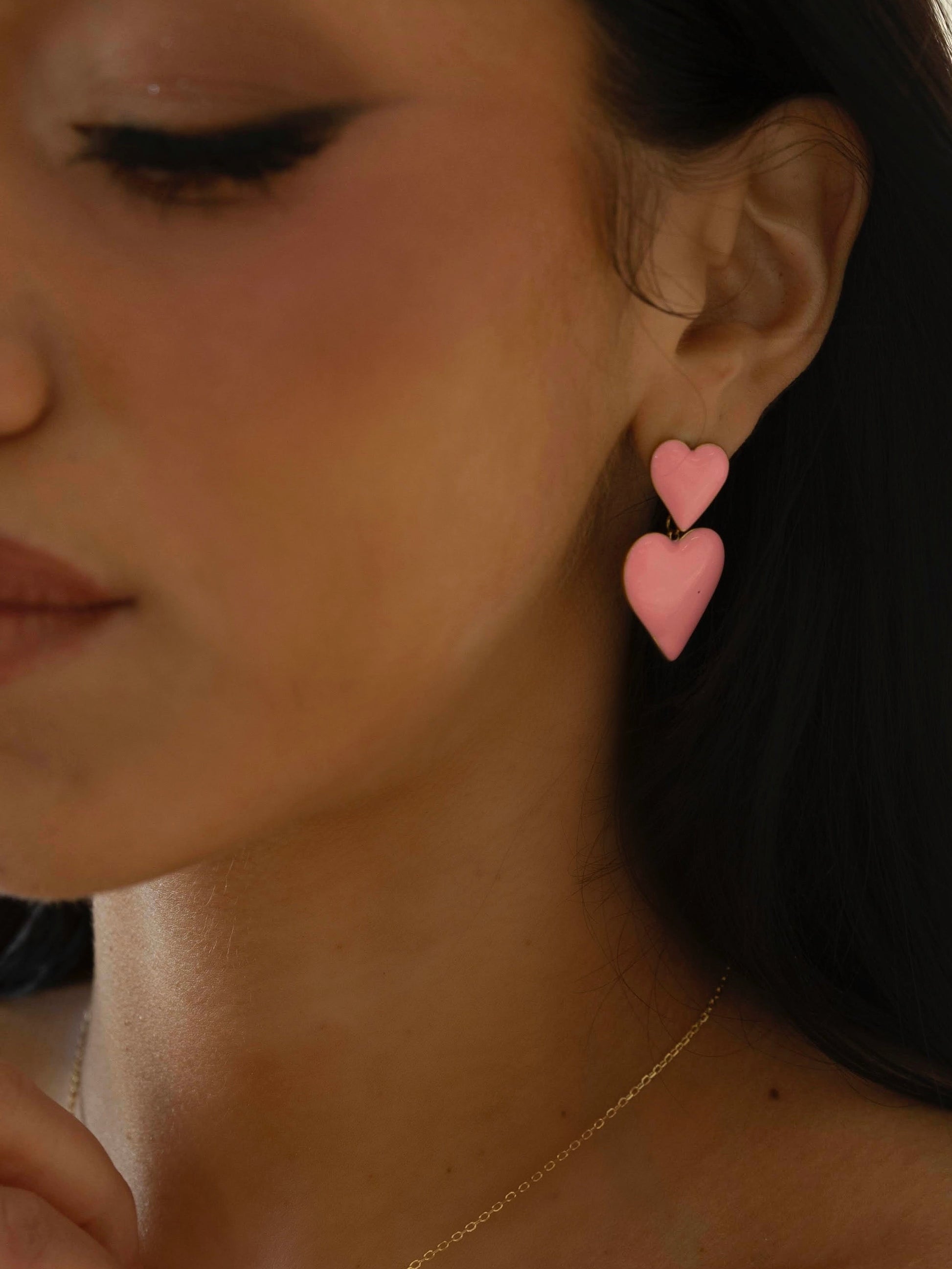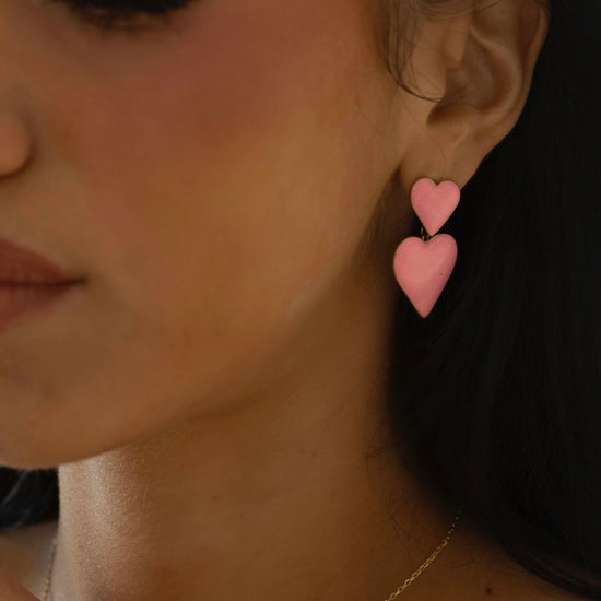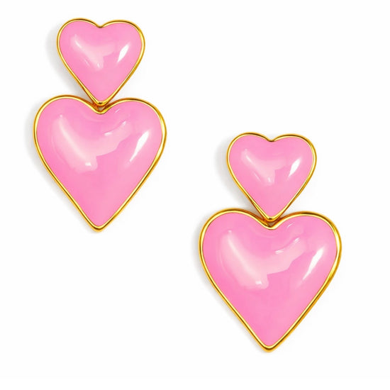 These super cute double heart earrings feature glossy pink enamel hearts outlined in 14k gold plated brass for the prettiest pop of color and shine.