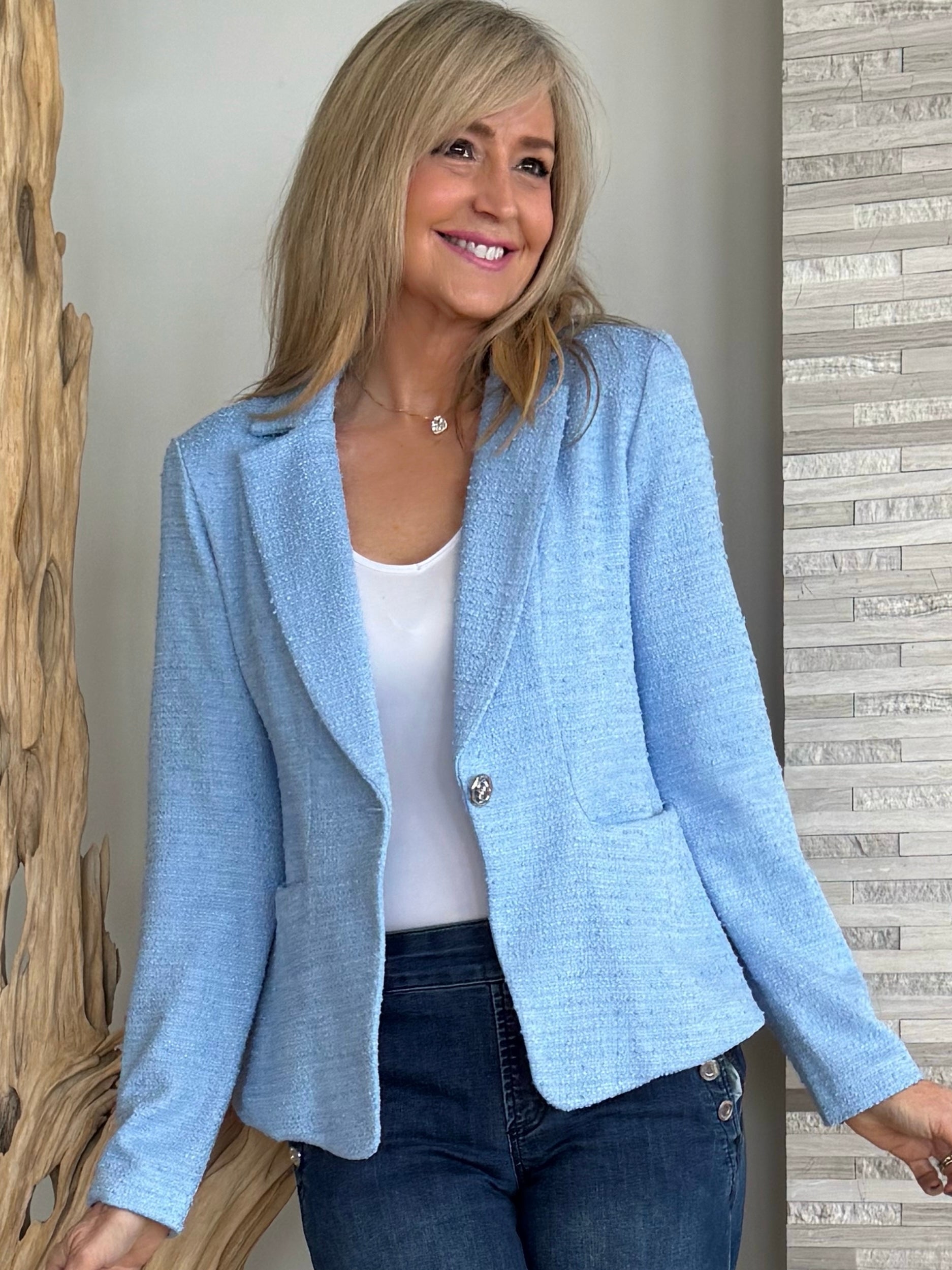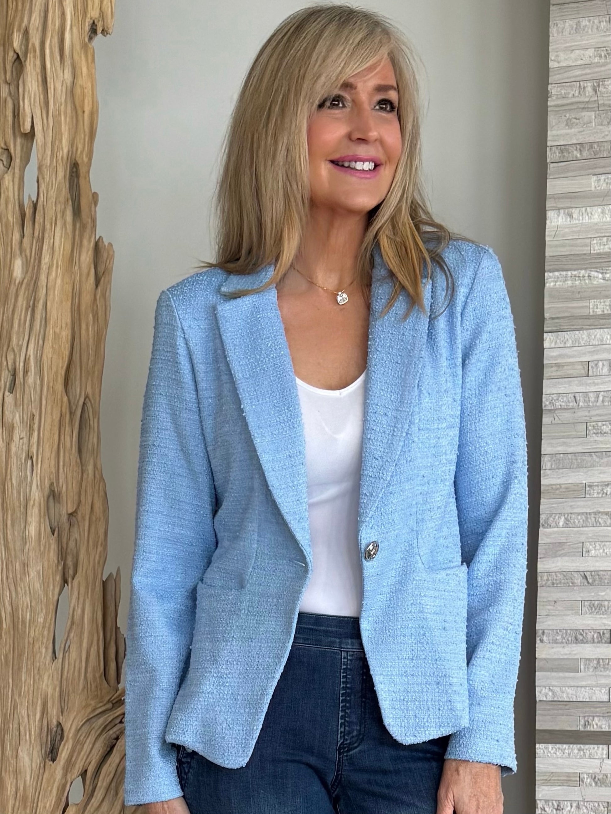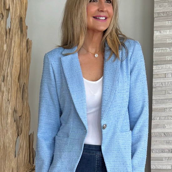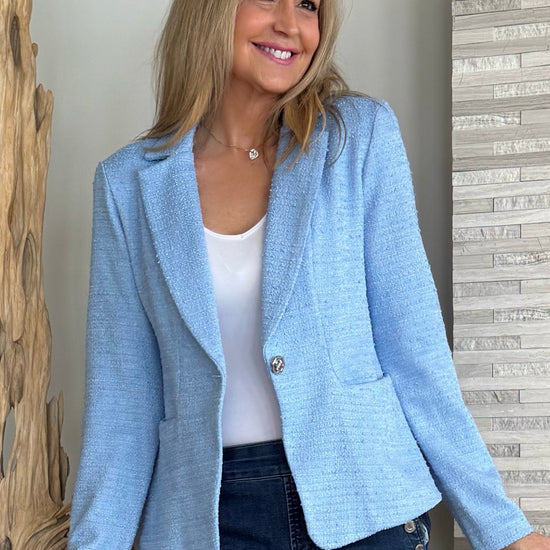 Exuding tailored sophistication, this textured bouclé blazer elevates any wardrobe with its refined detailing. A sharp notched collar and back princess seams create a flattering, structured silhouette, while front pockets add practical ease. Finished with a bold statement button, it’s a timeless piece that brings polished elegance to any ensemble.