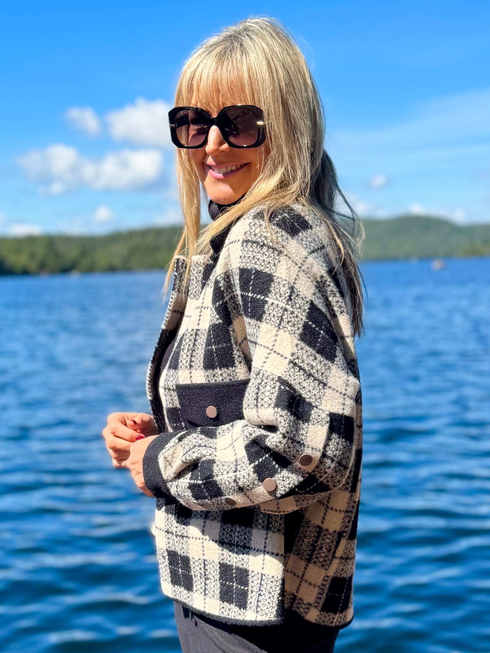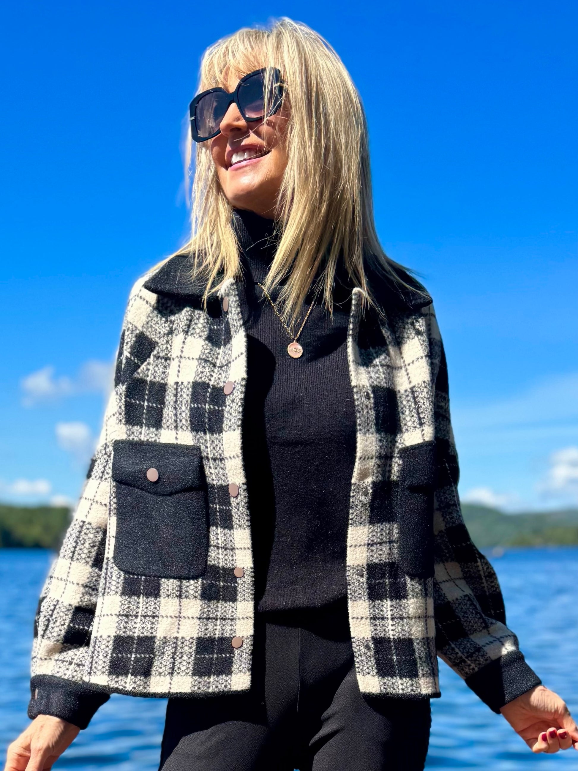 Make a statement in this super soft plaid contrast jacket, designed with eye-catching details and everyday comfort in mind. Featuring a sleek black collar, snap button front closure, and matching snap buttons on the sleeves, this jacket is both functional and fashion-forward. Finished with square chest pockets for a touch of utility, it’s the perfect layer to elevate any casual look.
