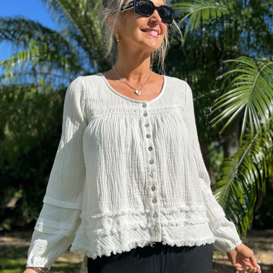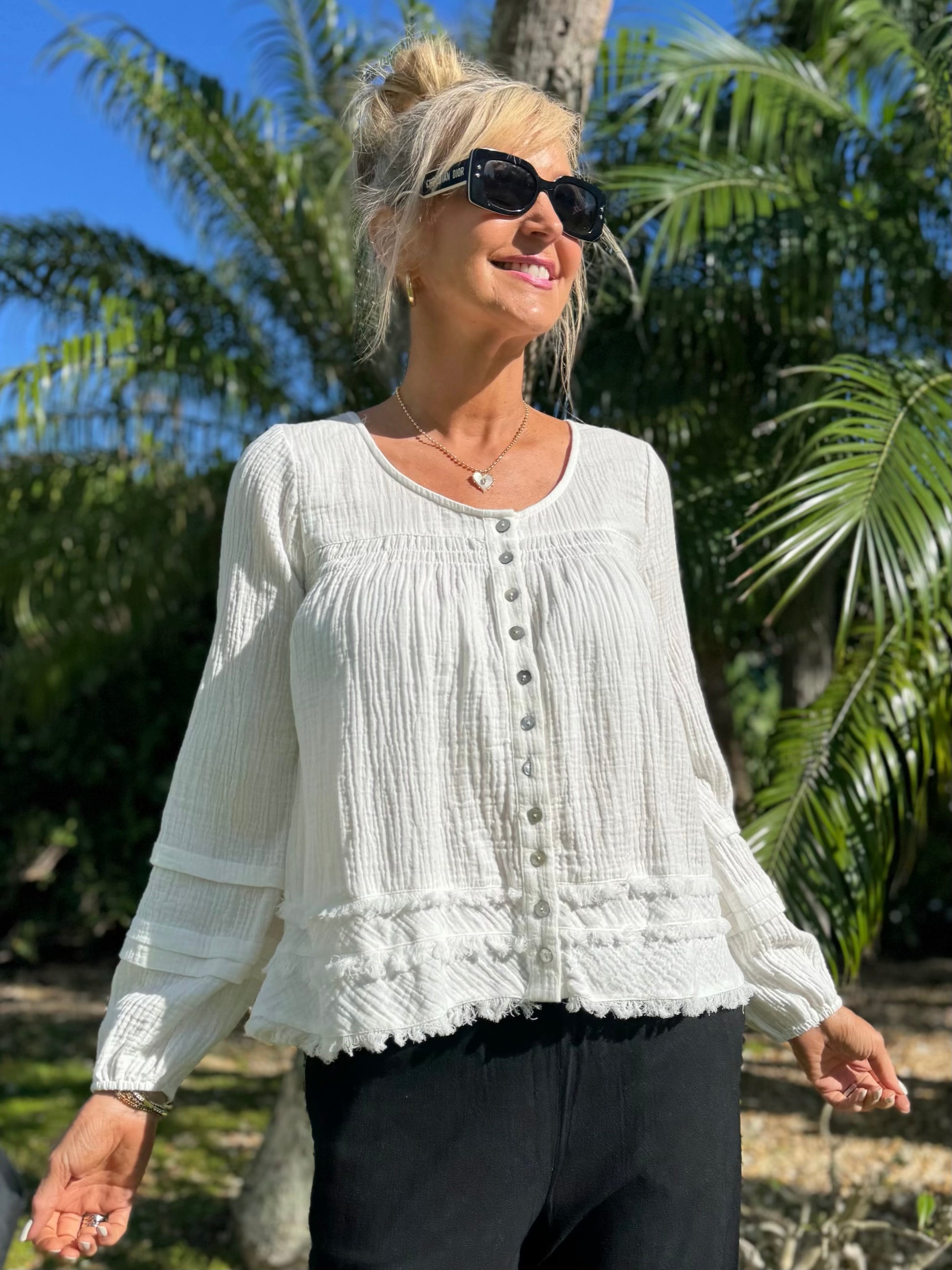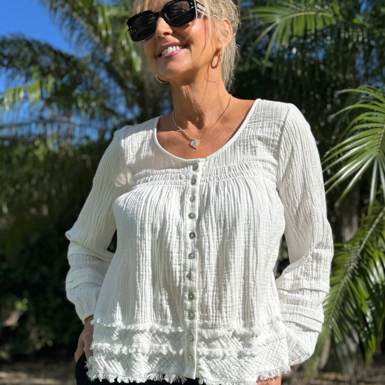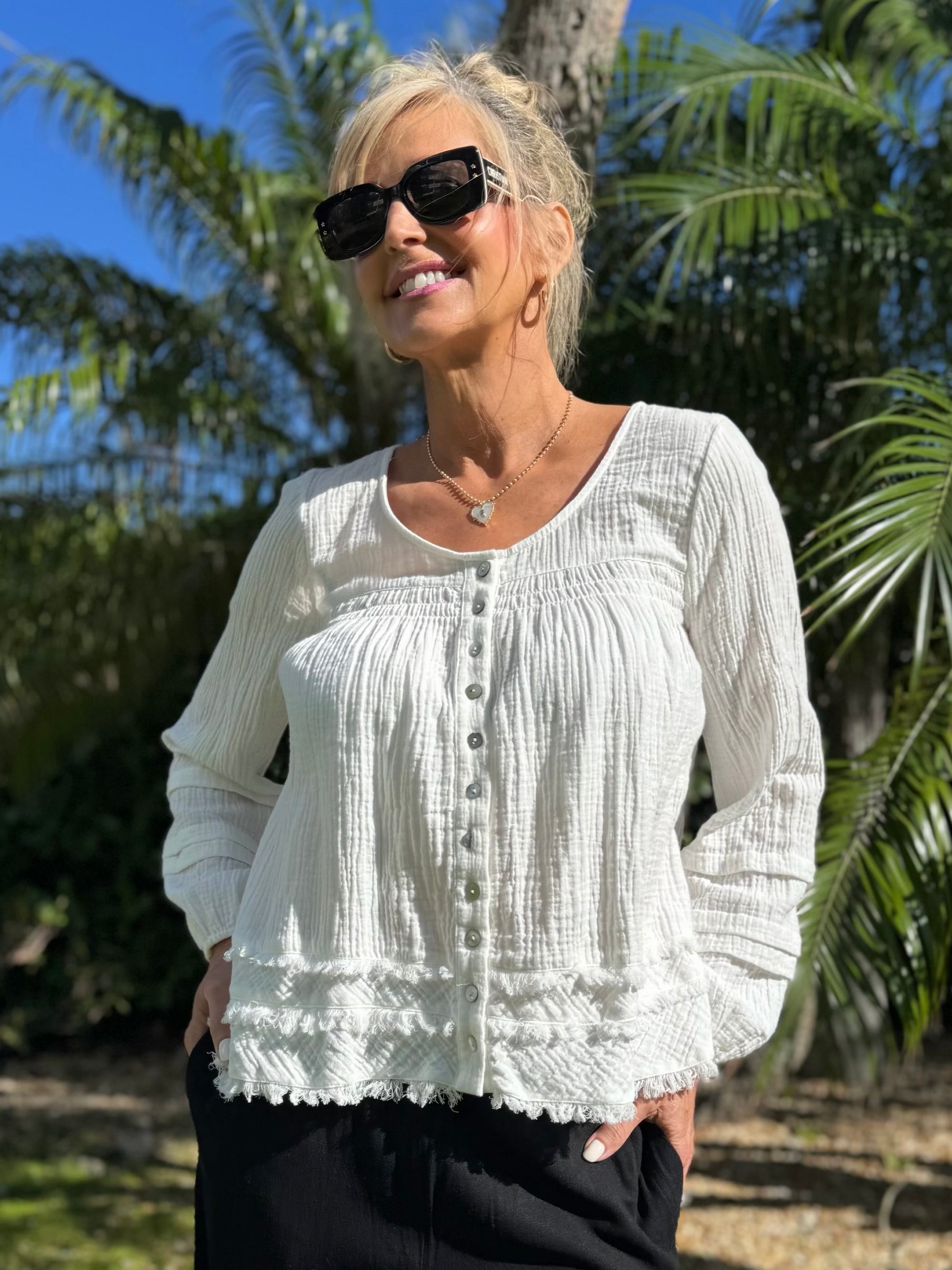 This front-button tiered A-line blouse features delicate smocking and a softly raw edge for an effortless, lived-in look. Designed with a relaxed silhouette that flows away from the body, it’s lightweight, flattering, and easy to dress up or down. Perfect with denim for everyday wear or styled with tailored pieces for a chic, casual-polished outfit.
